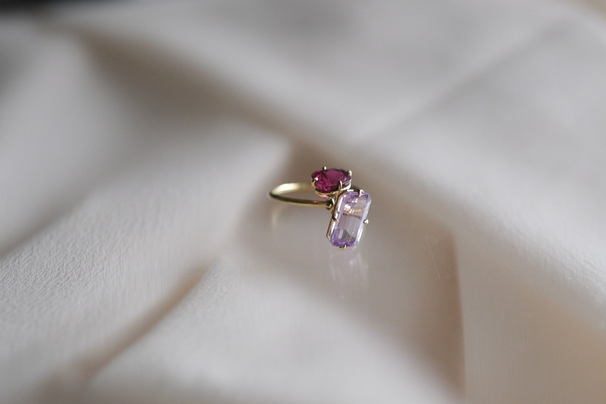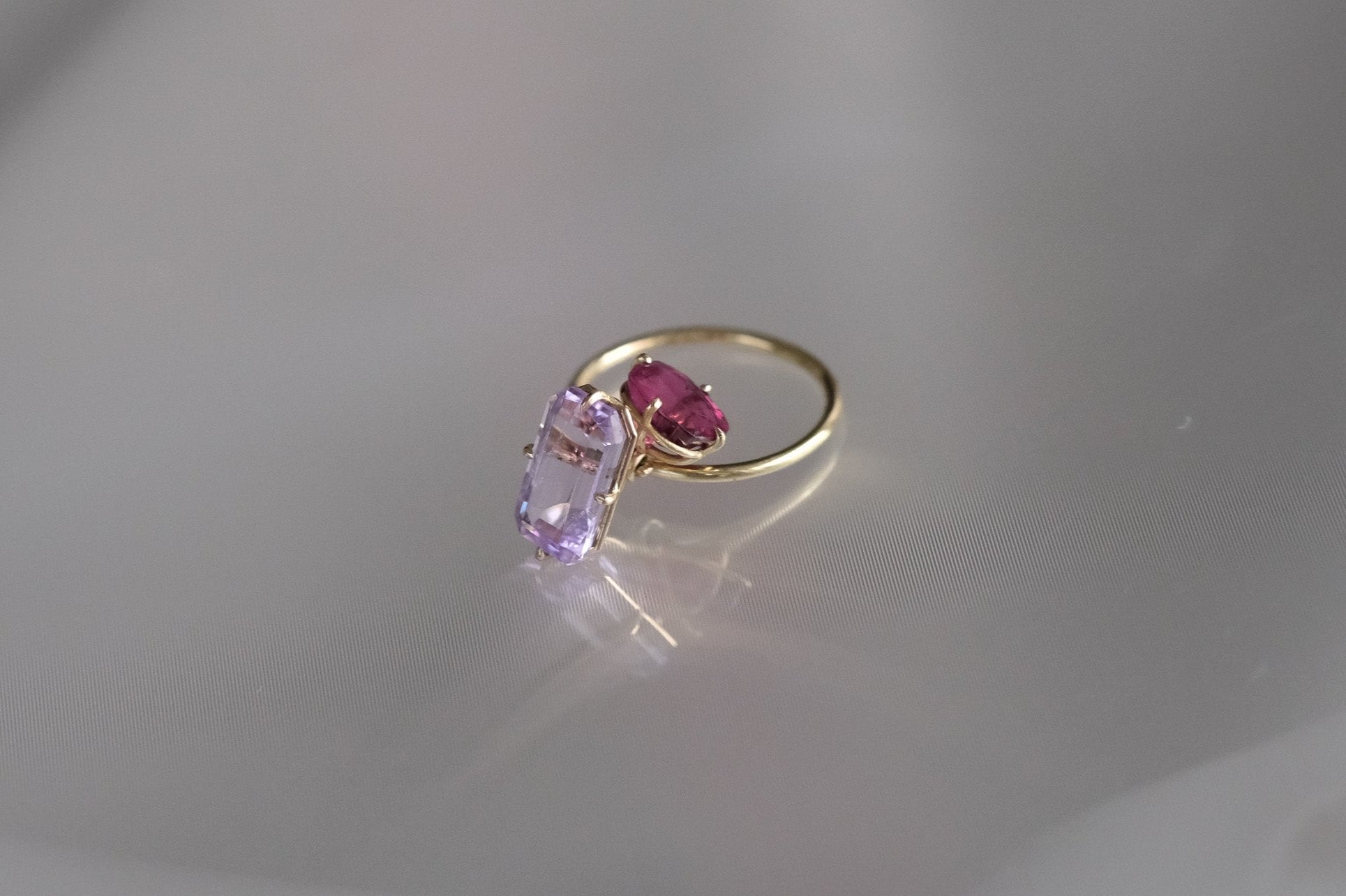 A captivating blend of femininity and elegance, this ring from the Pirouette Collection showcases a stunning 5.35ct Kunzite paired with a 0.83ct Pink Tourmaline. The Kunzite’s soft, delicate blush is beautifully complemented by the vivid and vibrant pink of the Tourmaline, creating a romantic and harmonious color pairing.