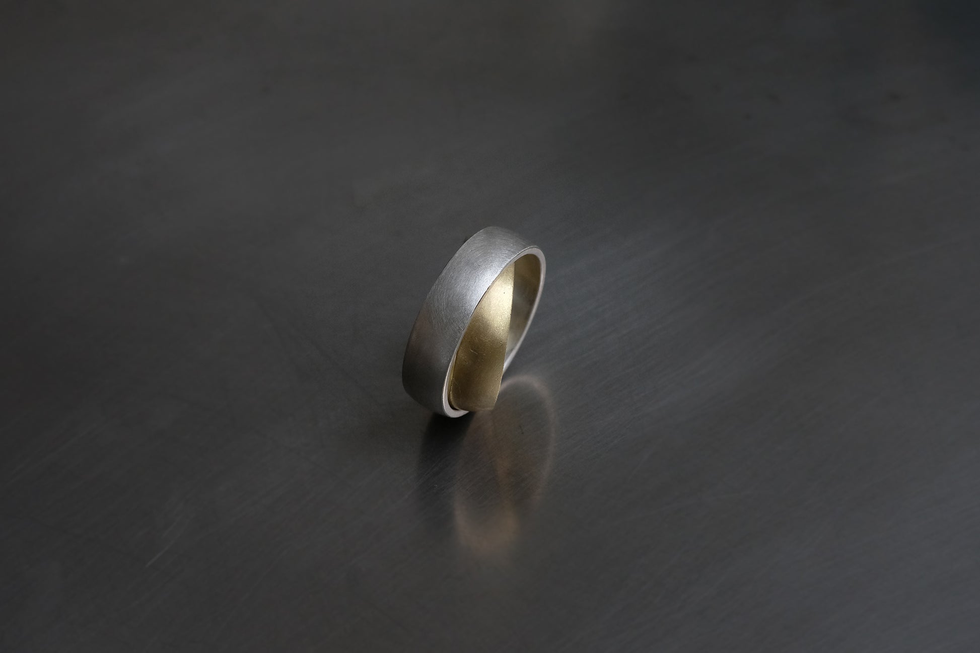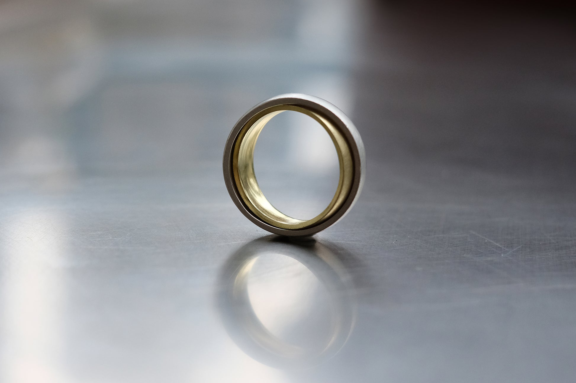 The pristine aesthetic is accompanied by precise craftsmanship to grant its movement. Two convex bands interlock one another, snugly fitted in place, yet free to orbit unrestrained.