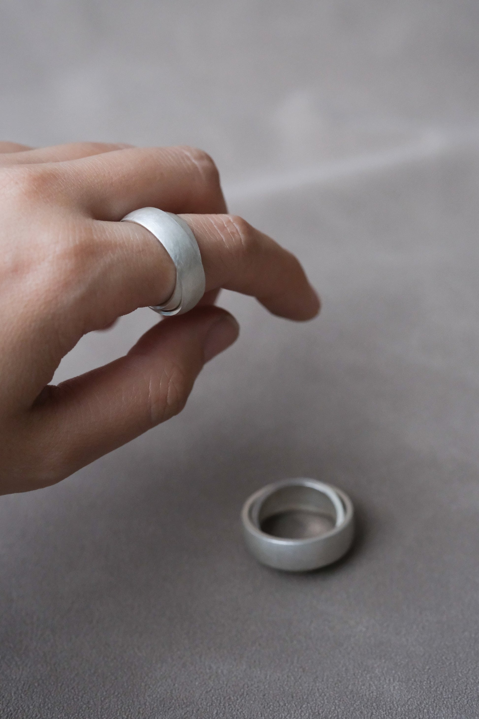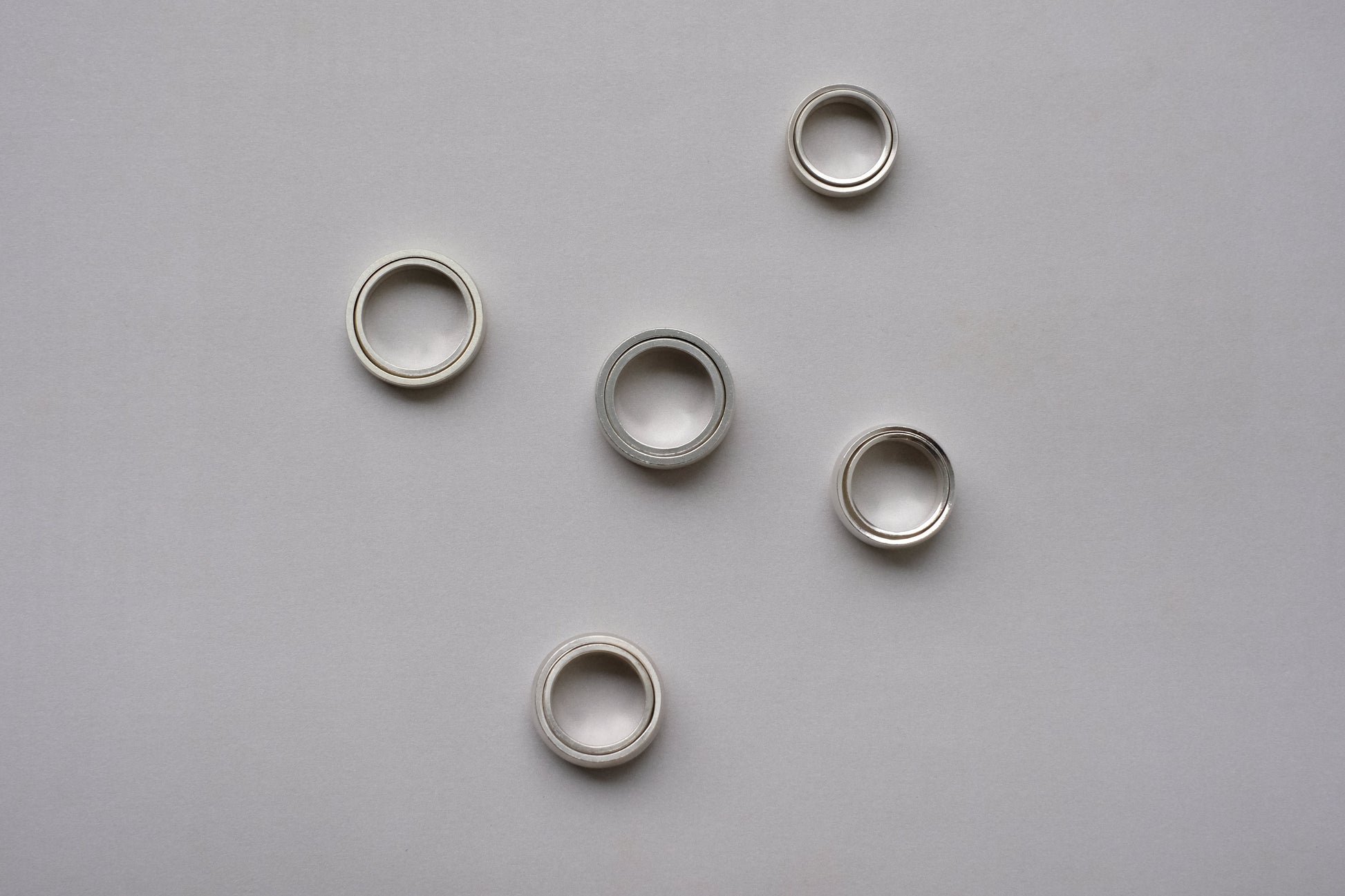 One for luck; two for joy. Under the minimalist guise, this kinetic ring design is borne from a need for relaxation.