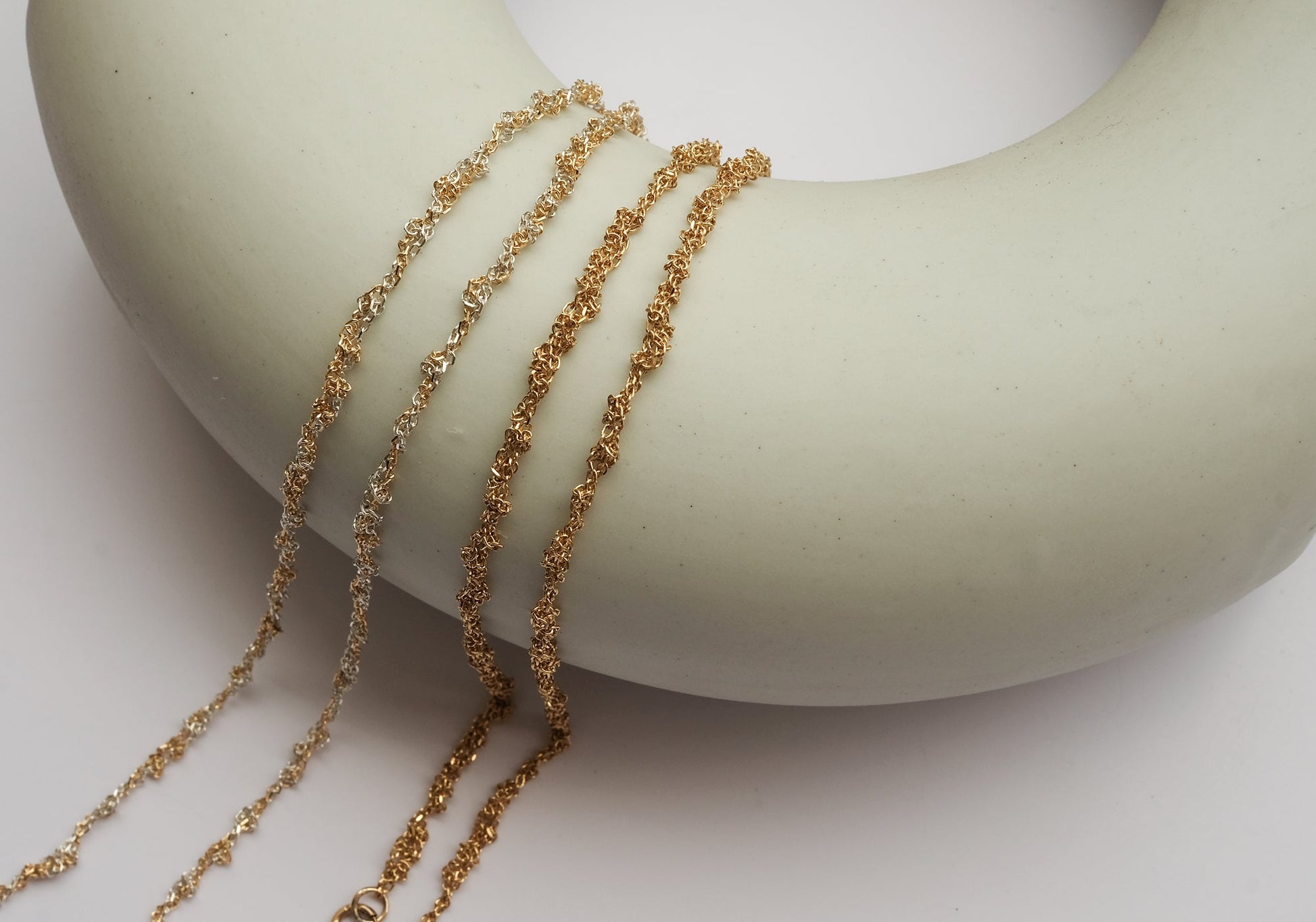 Of all things tangled, only this necklace can abide with such grace. The necklace is intertwined into knots and braids, creating a unique, organic silhouette around the neckline.