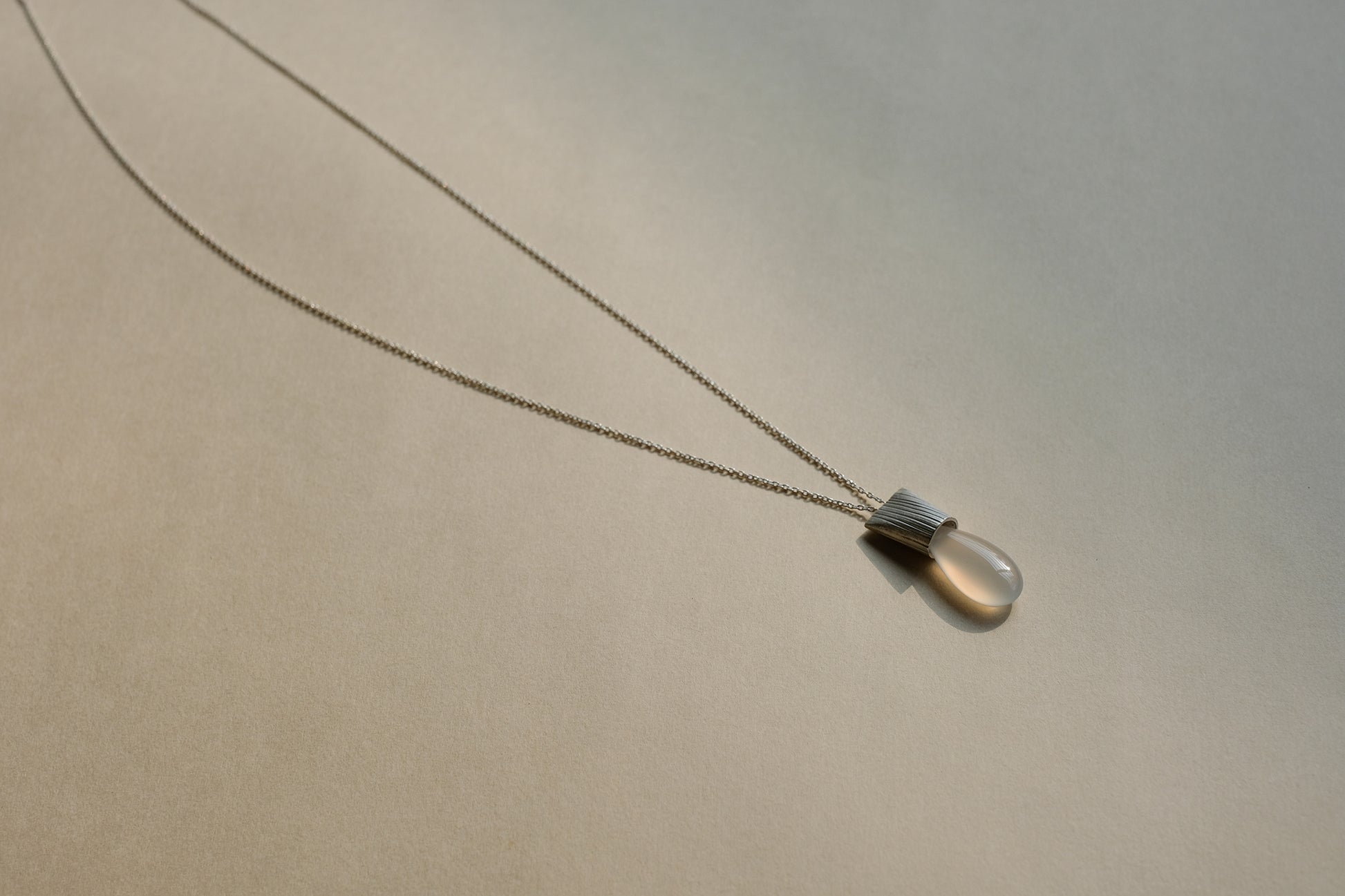 An agate droplet seeps through the fluted stem, frozen in its delicate poise to adorn. A ridged rim of sterling silver, reminiscent of a stem is brought to an abrupt end, below it hangs a gem carved dew. Captured in a delicate position, the gem shivers and swing to every movement of its wearer.