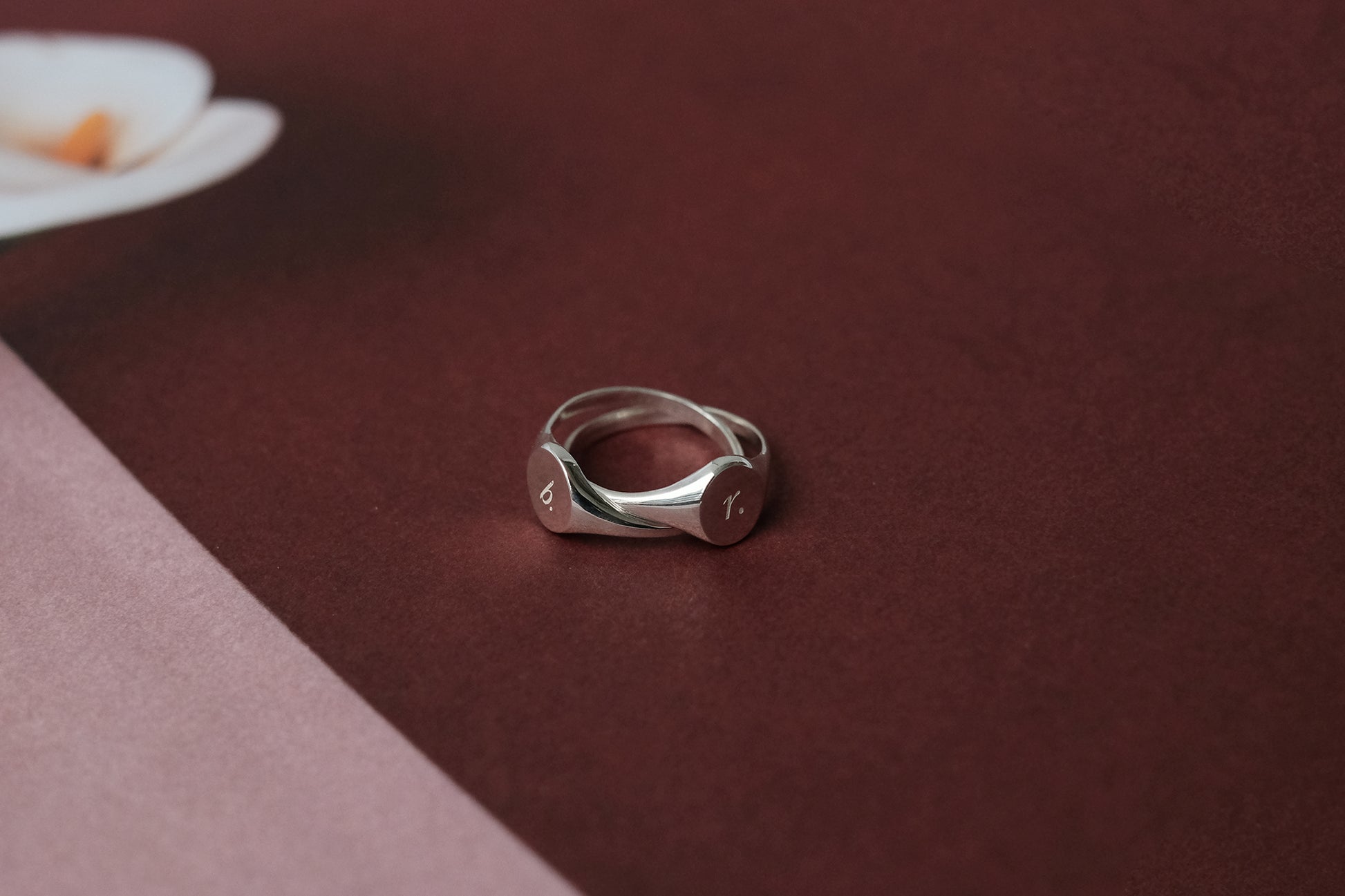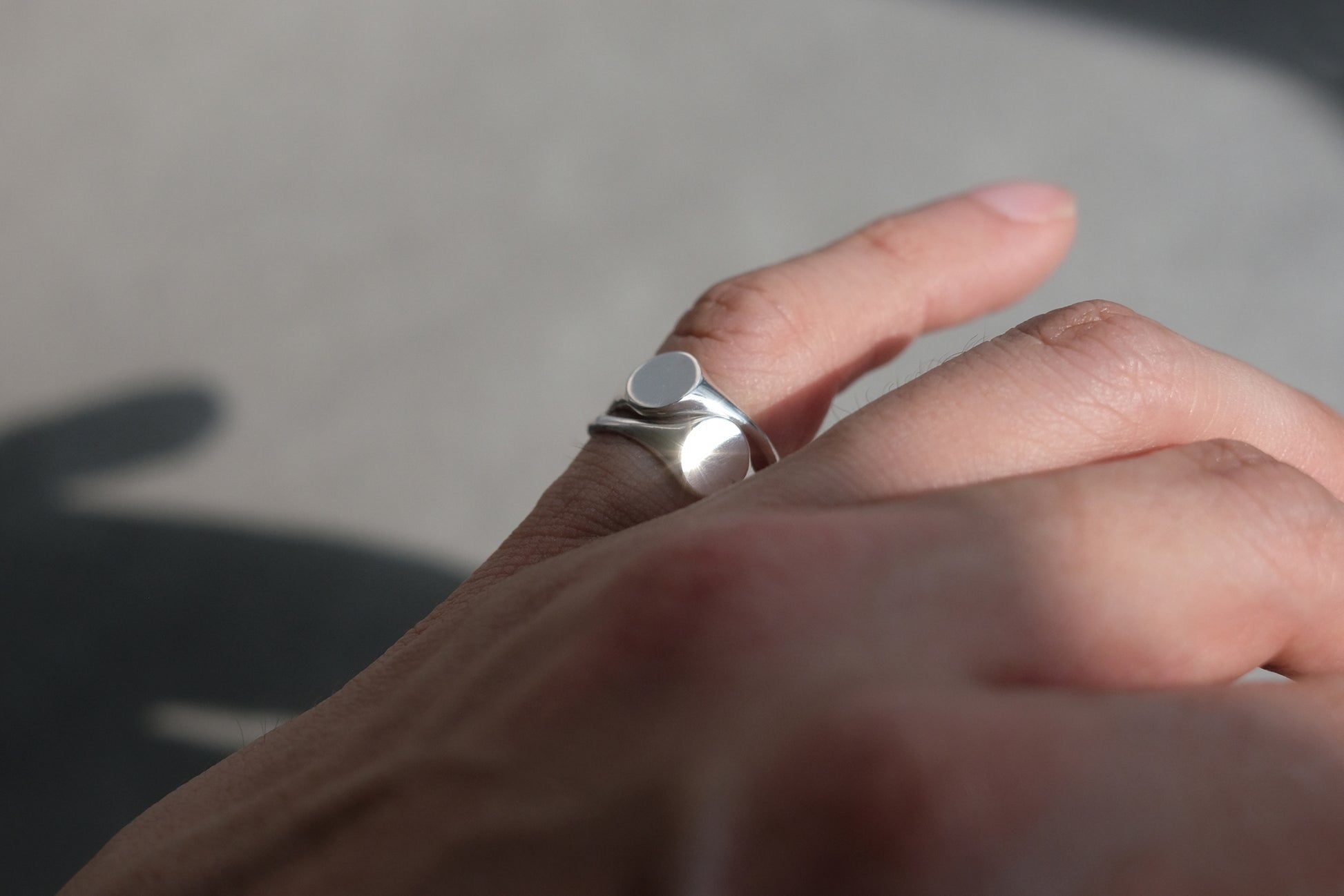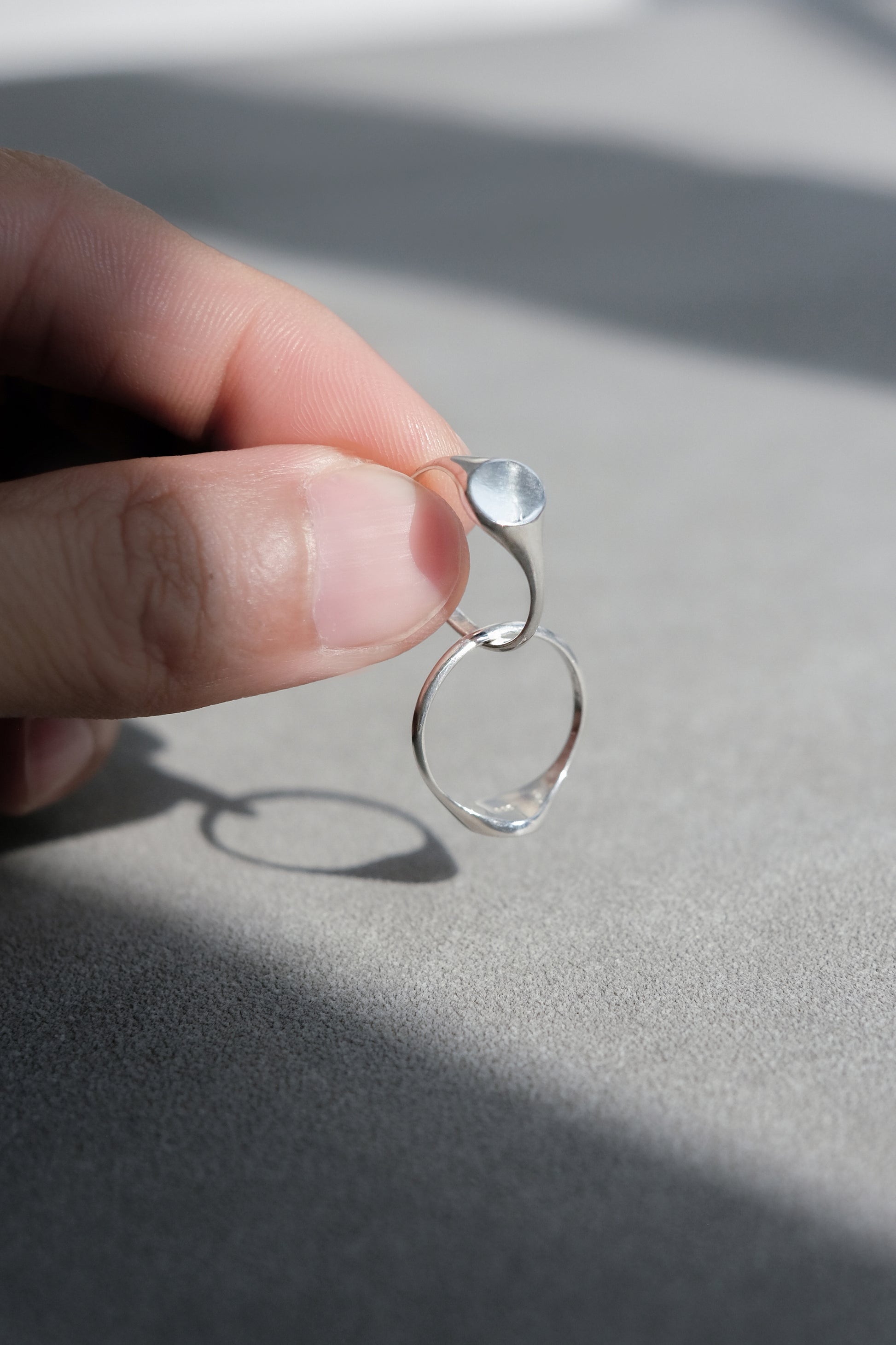 A duo of interlocking signet rings exudes romance touch. Like you are holding each other’s hands, when the two round seals meet, just like two heads romantically leaning against each.