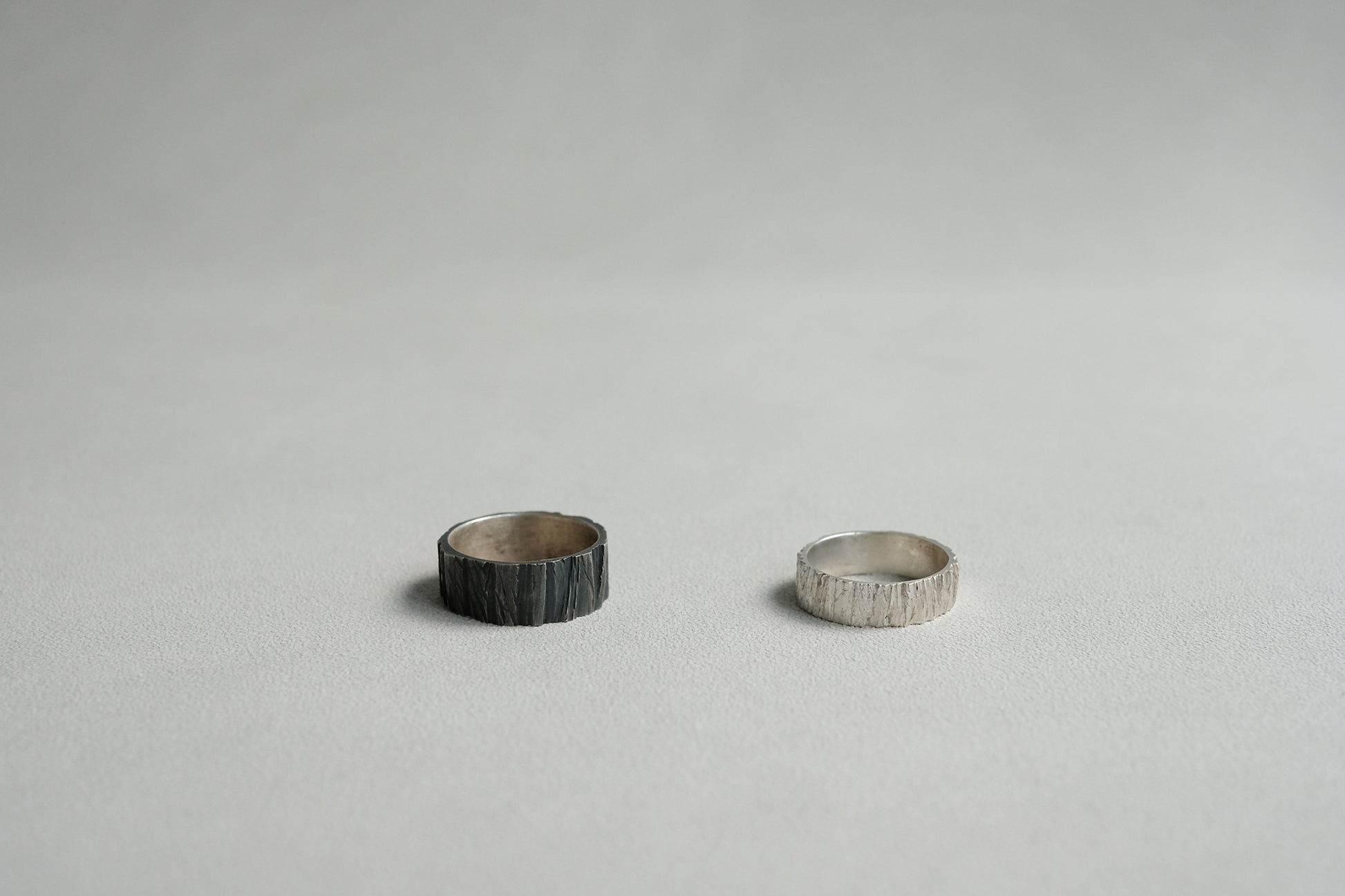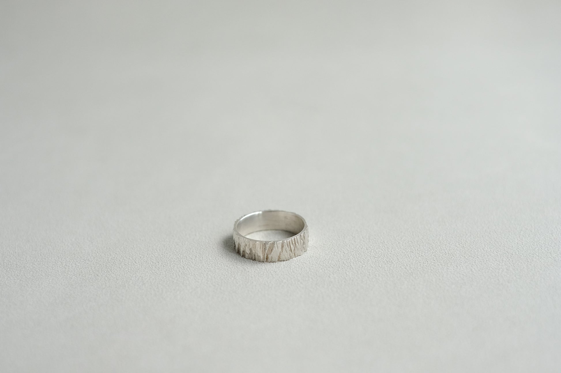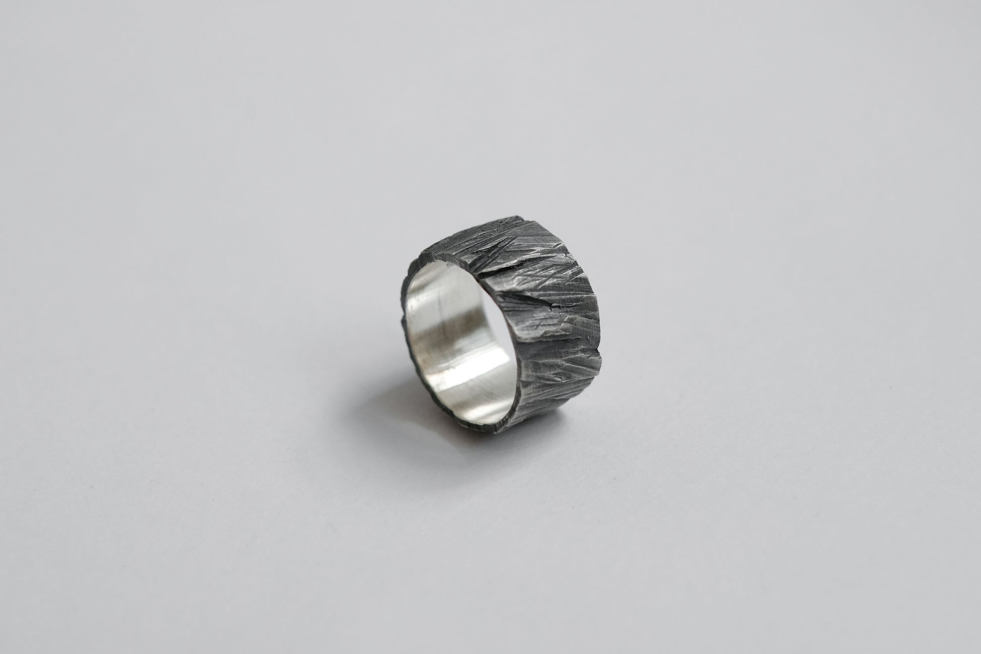 The carved texture on this ring gives it a primitive aesthetic, carrying a unique charm of its own. The partially oxidised finish accentuates the irregularities in surface textures, effectively complementing the entire piece.