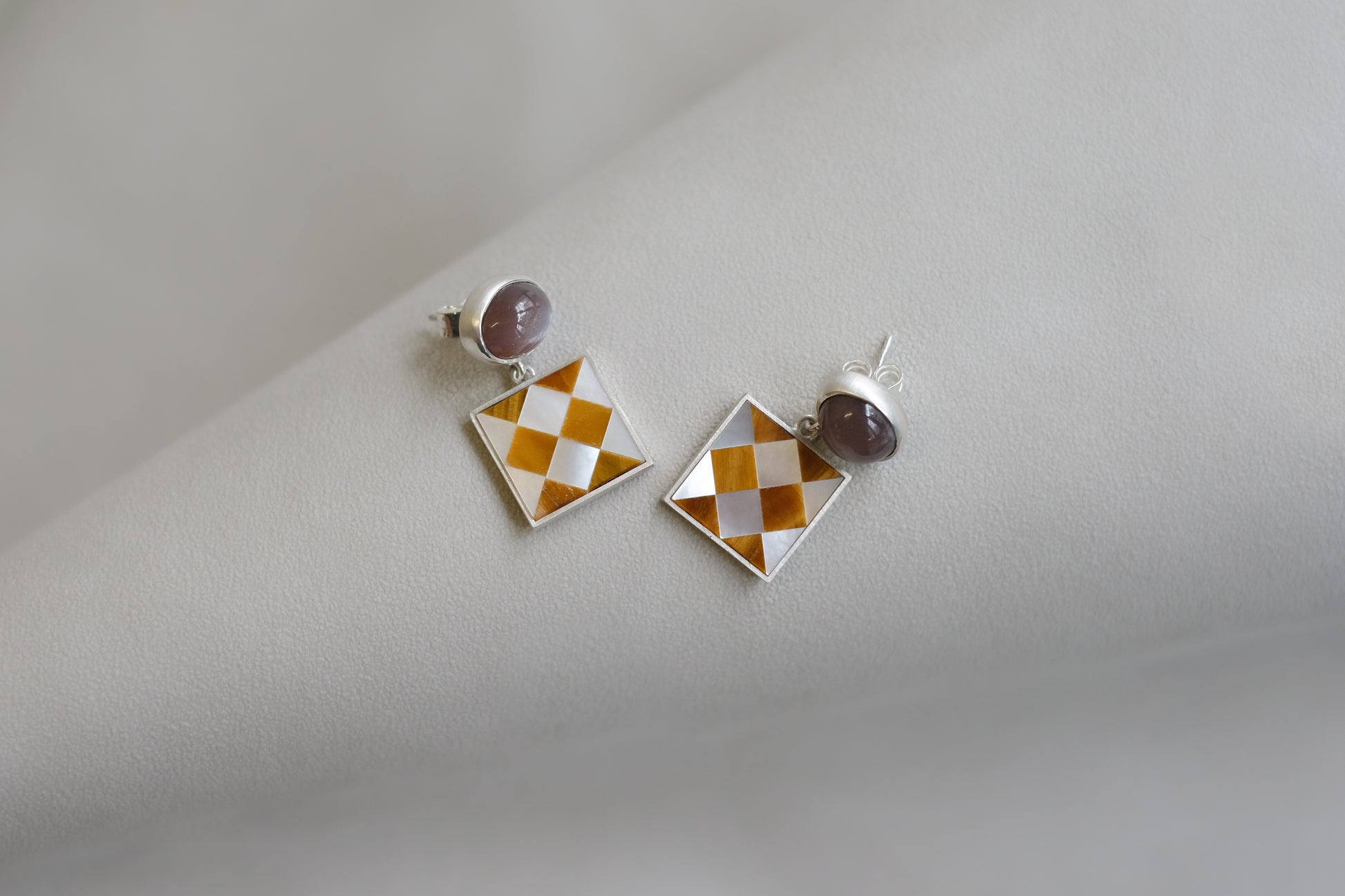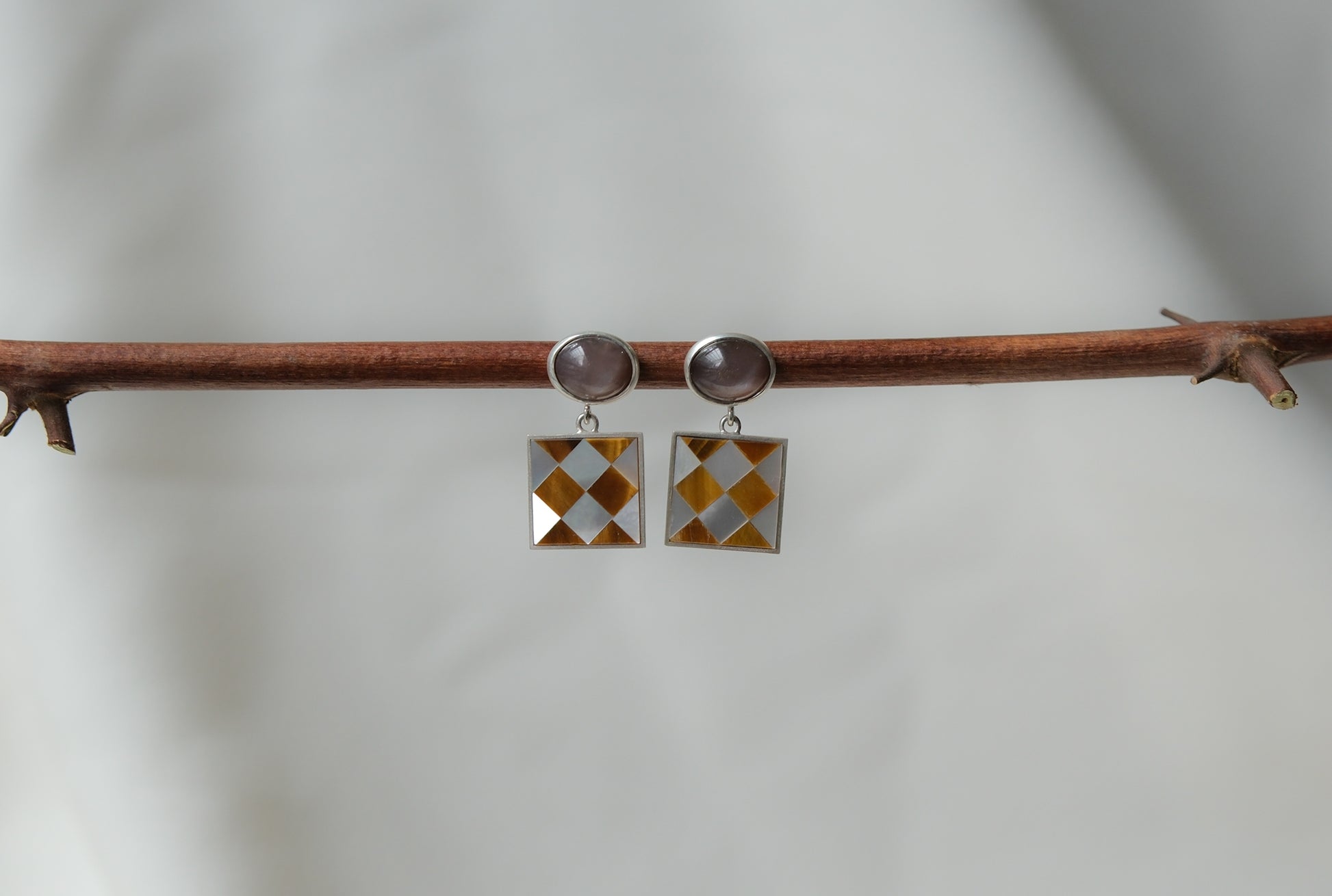 Material: sunstone, tiger eye plates, mother of pearl and sterling silver