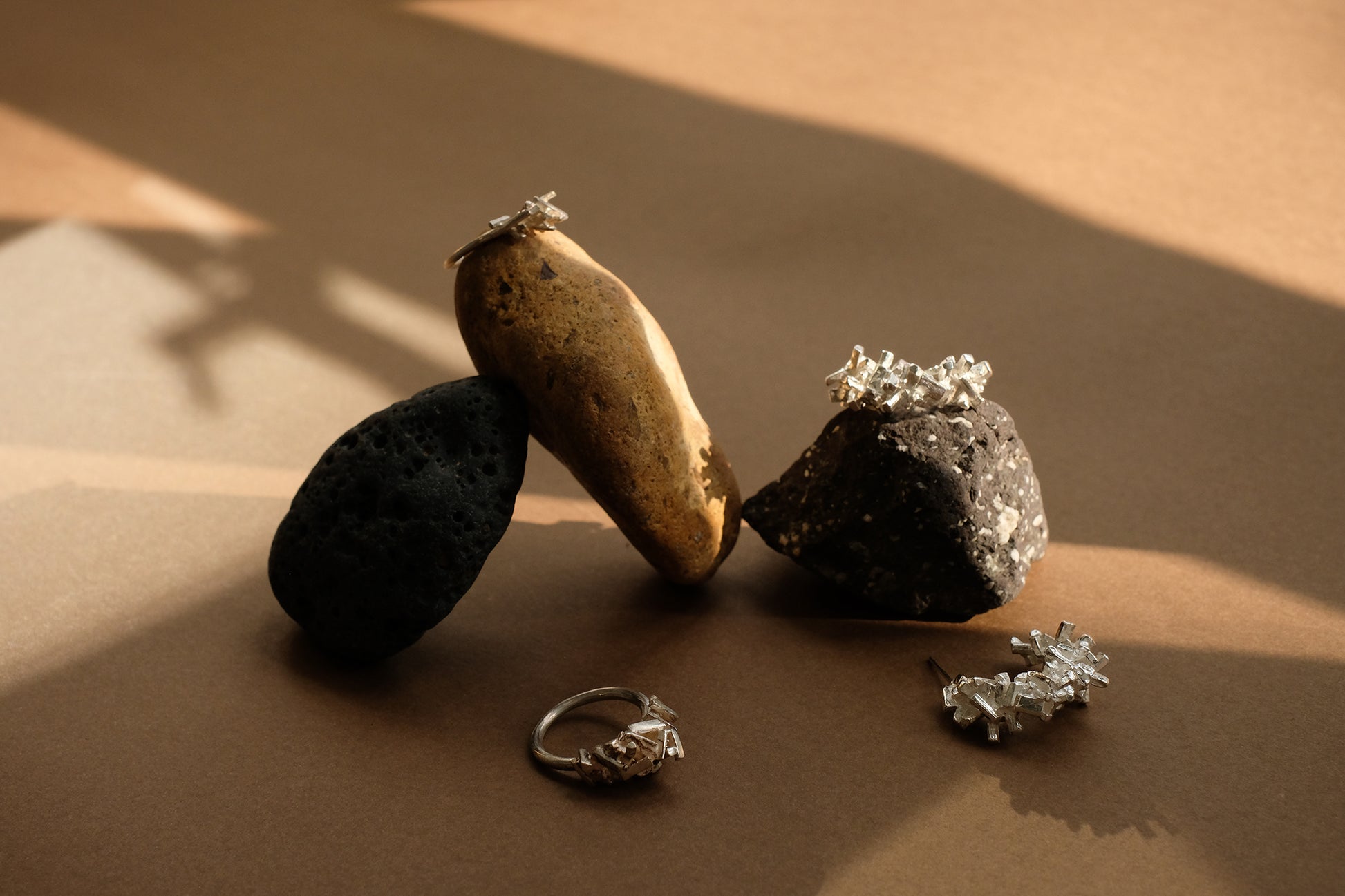 Sprinkled with prismic shards, the design finds balance between organic composition and geometry.