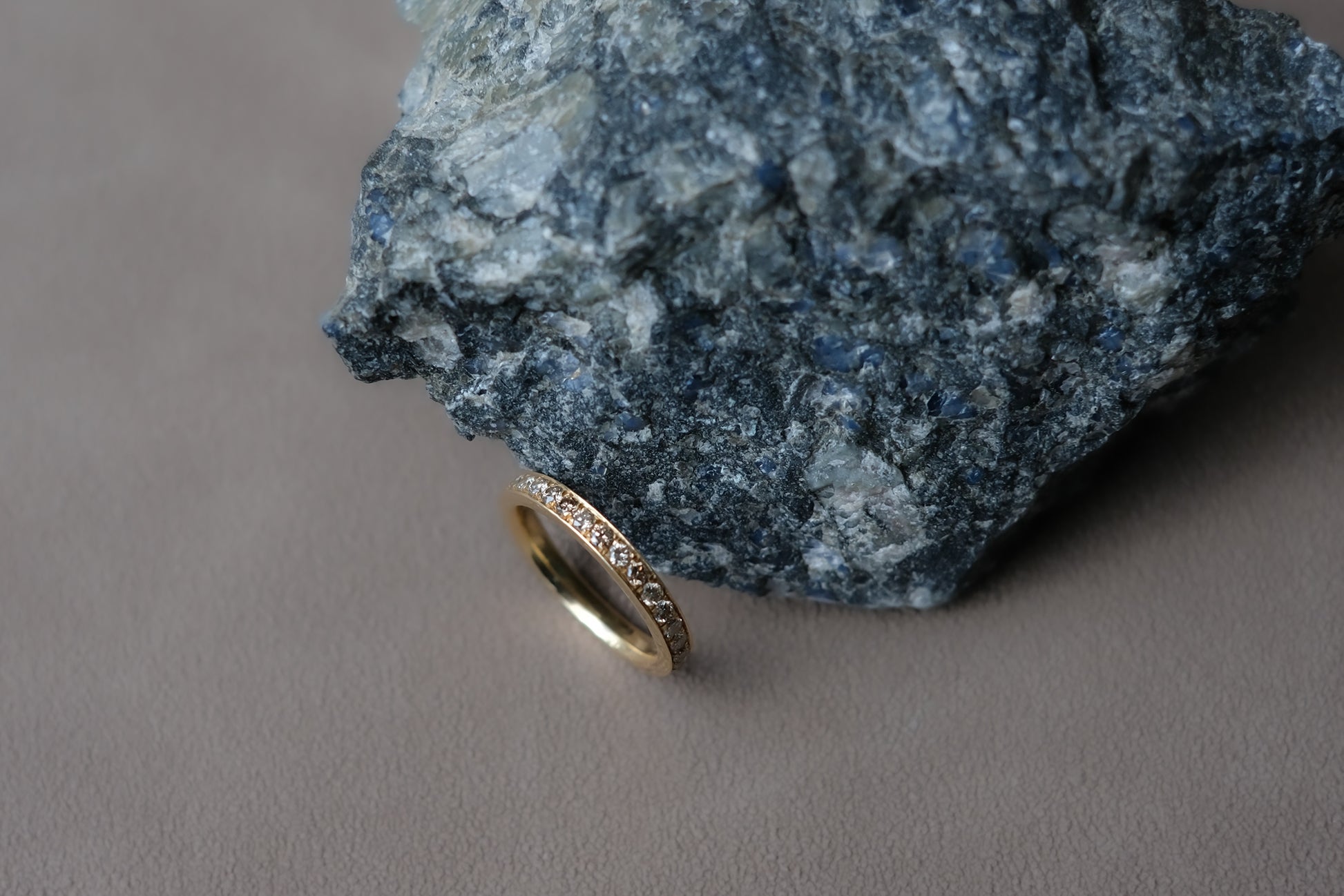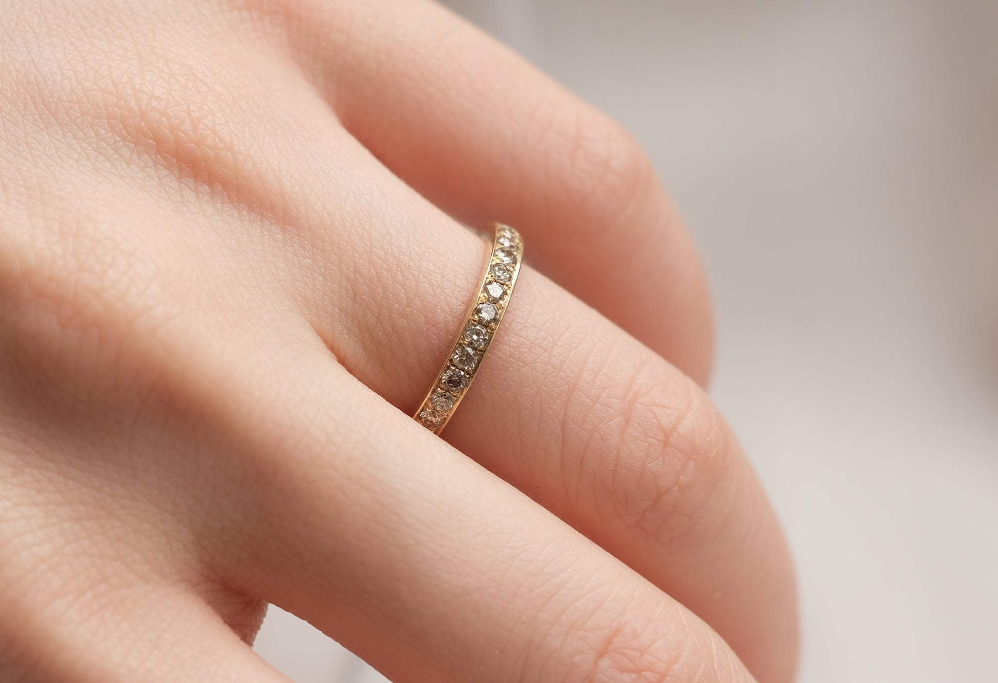 Eternity rings are exquisite symbols of eternal love, as they feature a seamless band of precious gemstones encircling the entire ring. This eternity band, crafted with champagne diamonds embedded onto an 18k gold band, showcases an astonishing color palette.