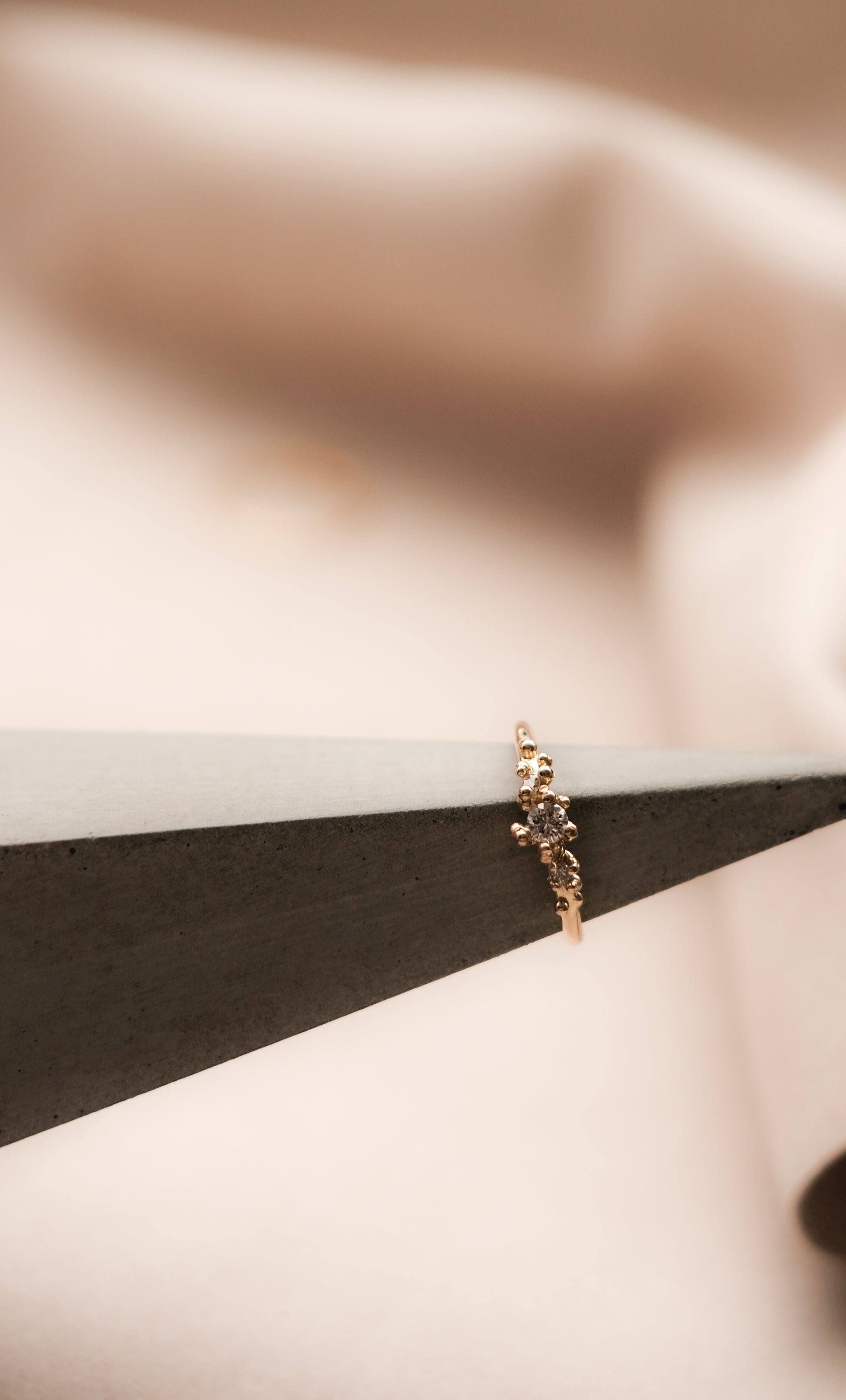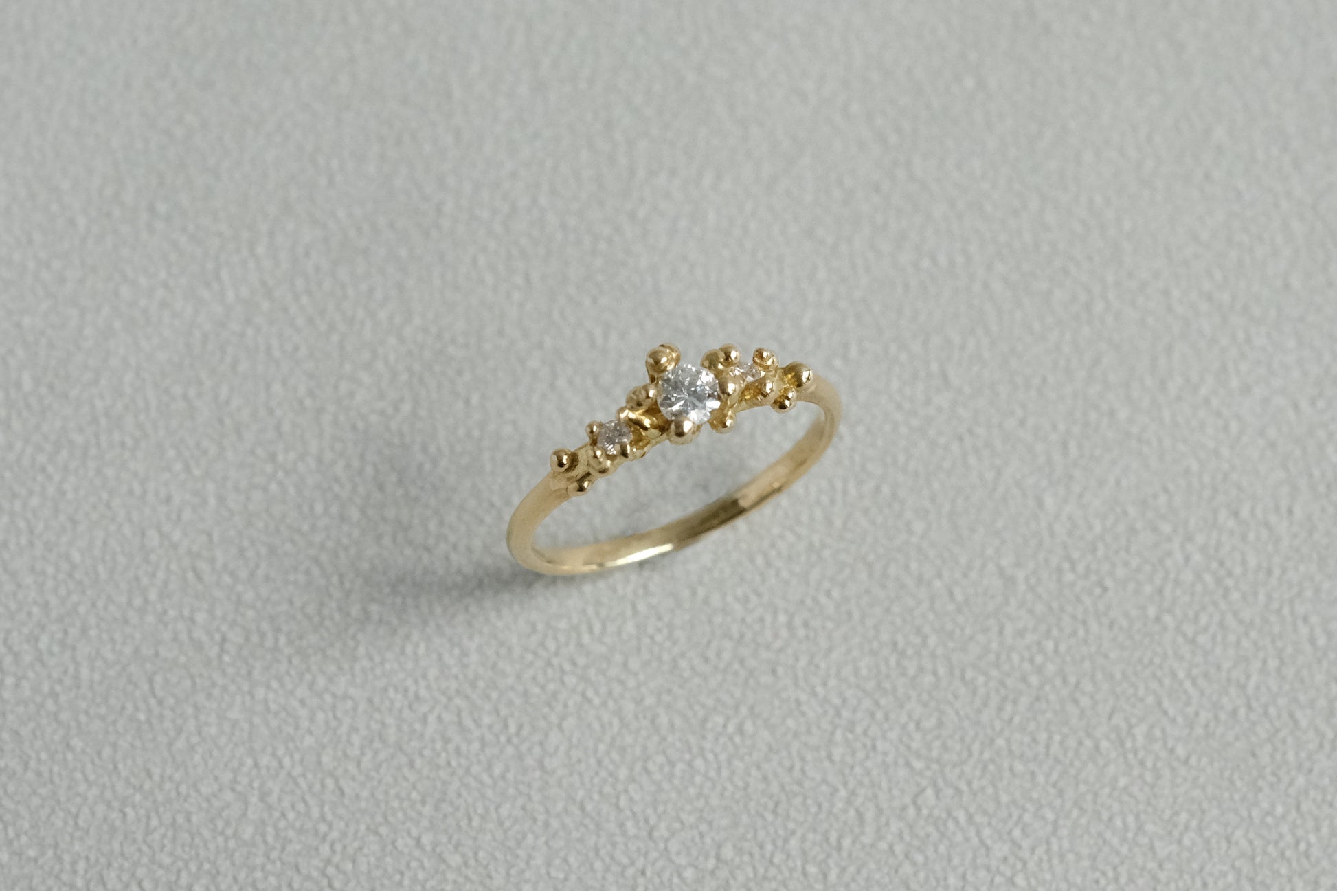 Belinda Chang gracefully captures the infinite beauty of the Cosmos to fit atop our fingers, thus becoming this granule ring. With diamonds and 18k gold granules poised at the top of the ring. The shimmering cluster embodies the raw splendour of both precious gems and metals, building a glamorous ambience in cohesion.