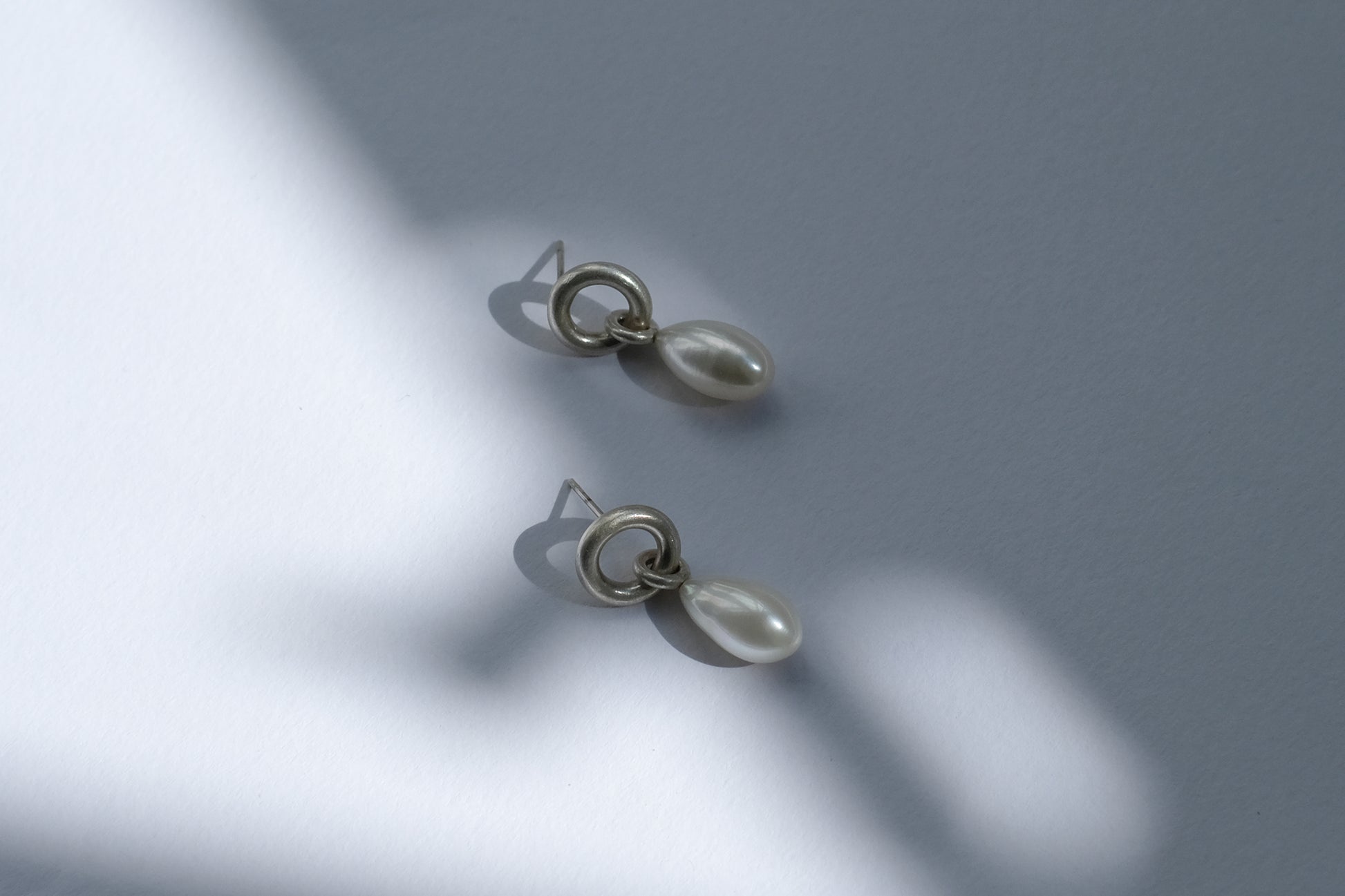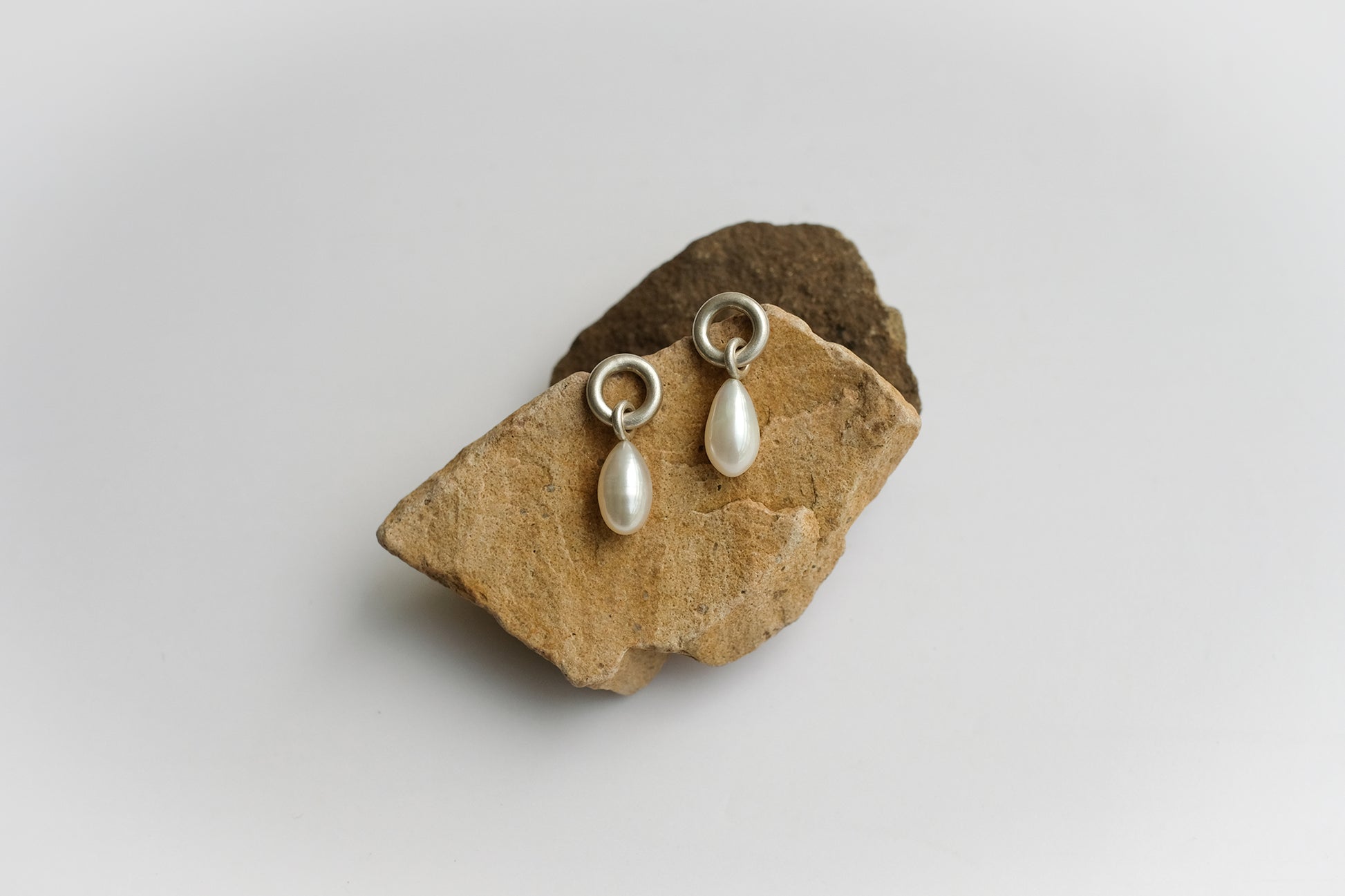 Dangling at the end of the silver hoops are tear shaped fresh water pearl. When worn, the pearl flutters to the subtlest of movements much like a tear drop quivering at the brim of the eyes.