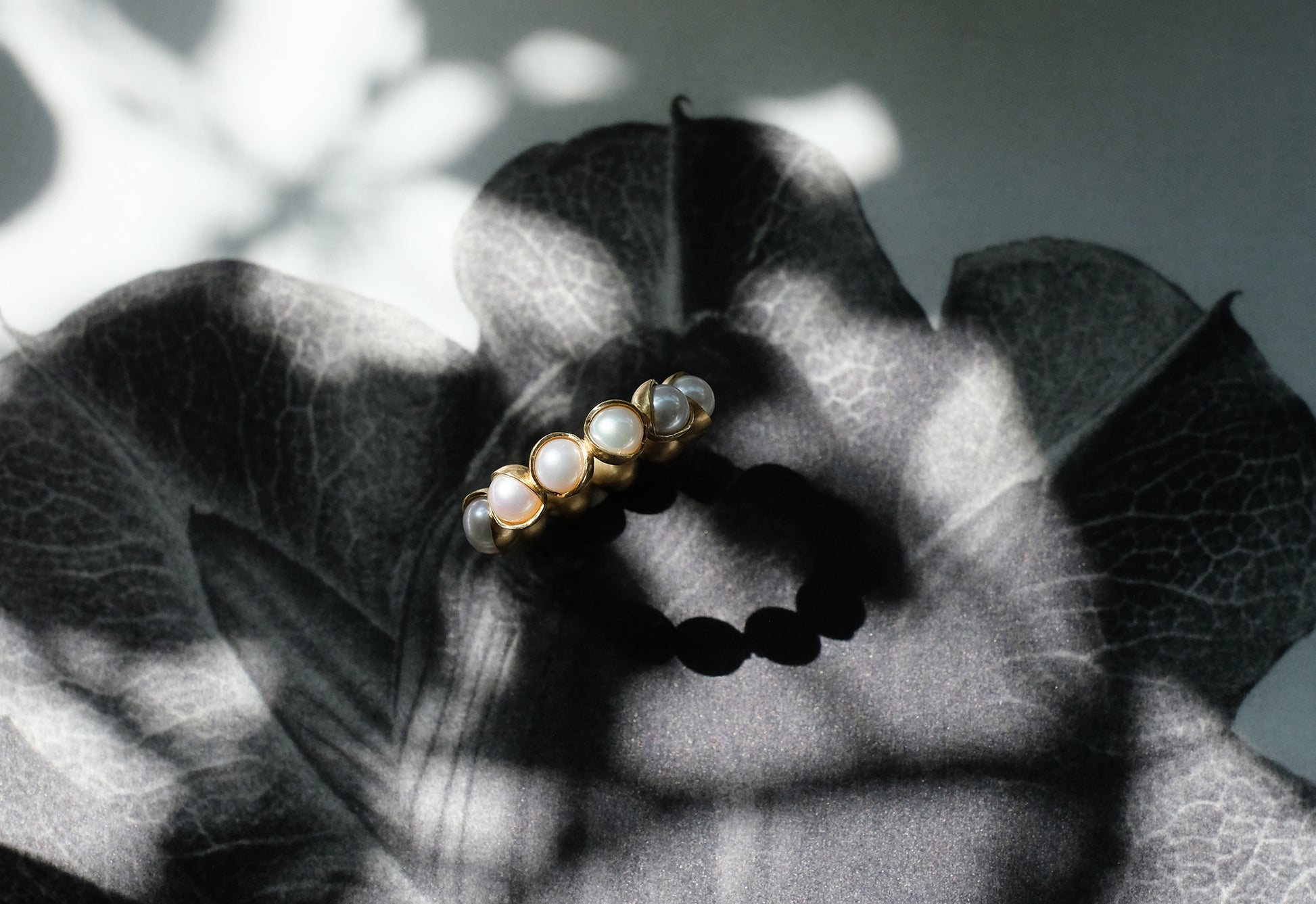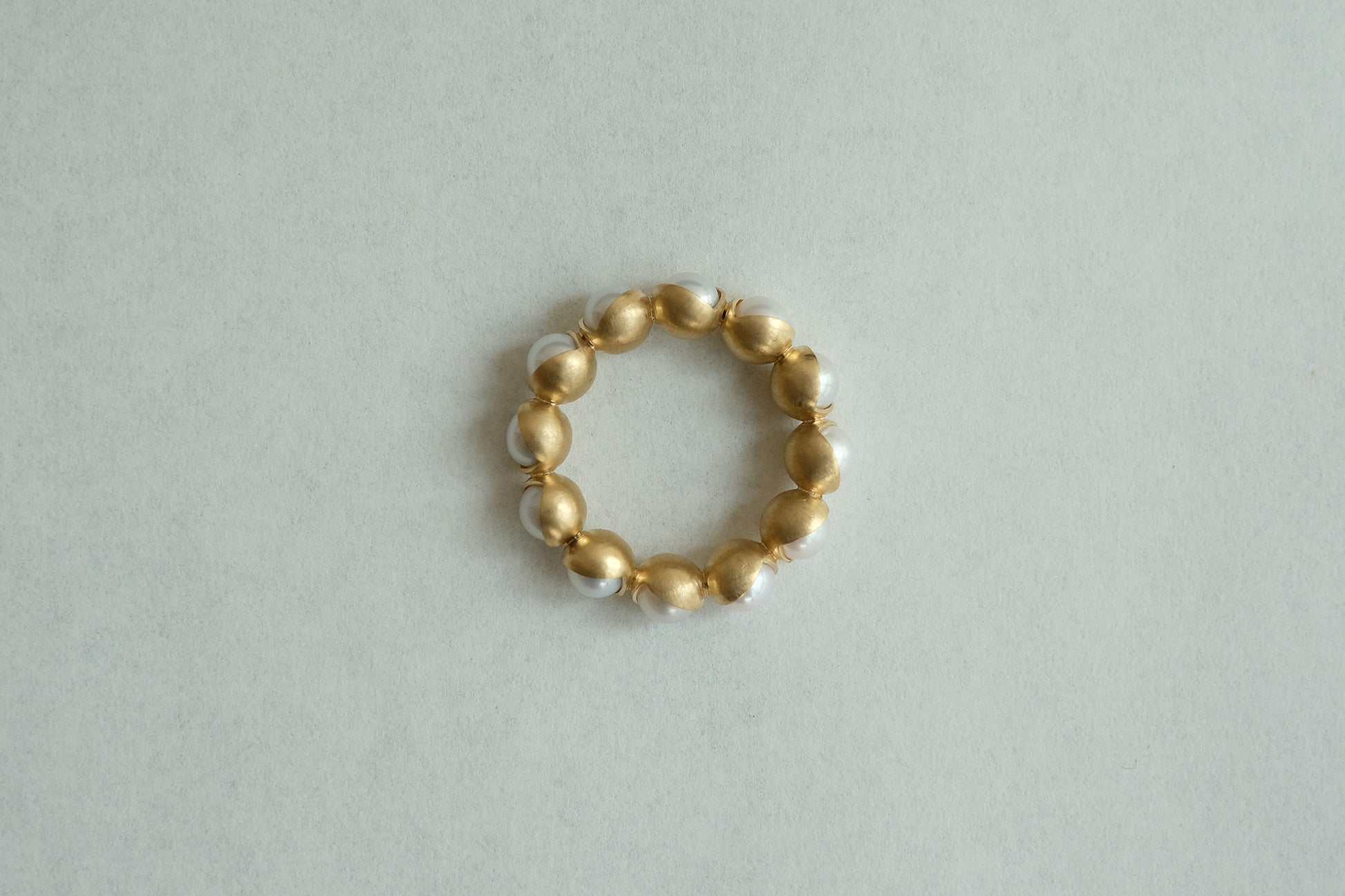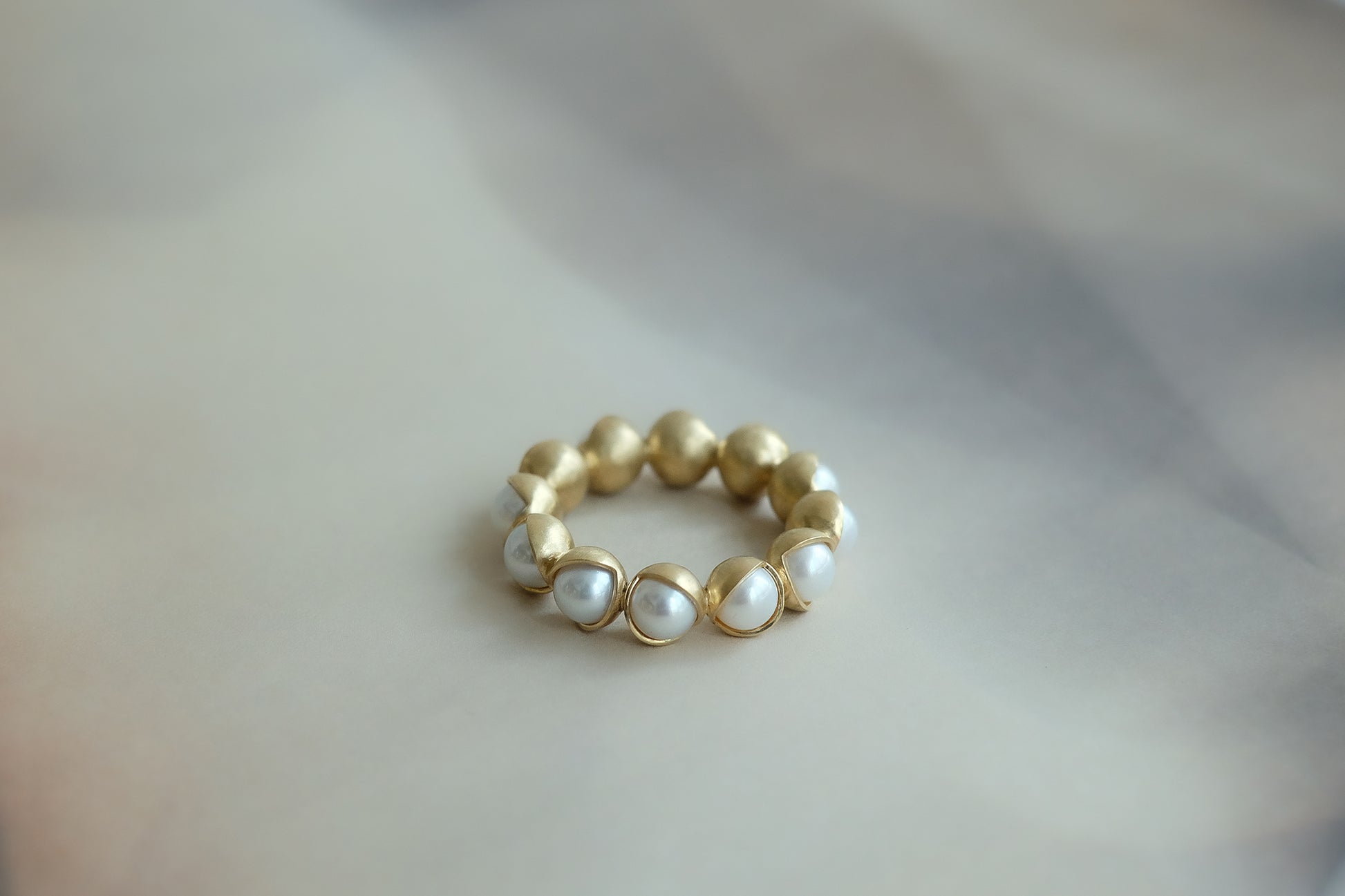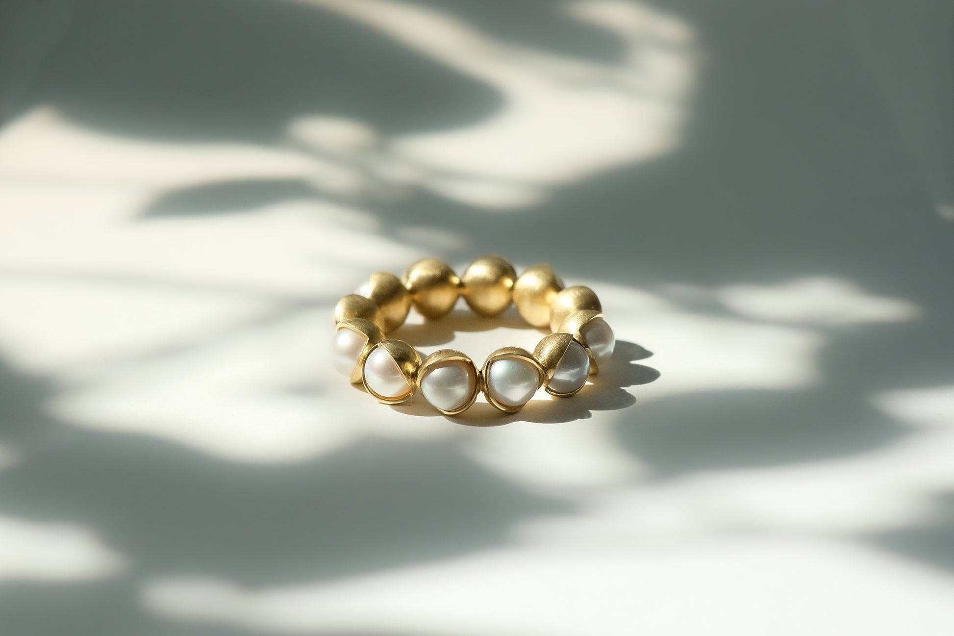 An artful design that promotes the natural charisma of pearls, this Eternity Fruity Pearl band features a unique composition of visual elements. Polished with 18k Gold for a lavish glamour, this ring showcase brilliance in contemporary design.