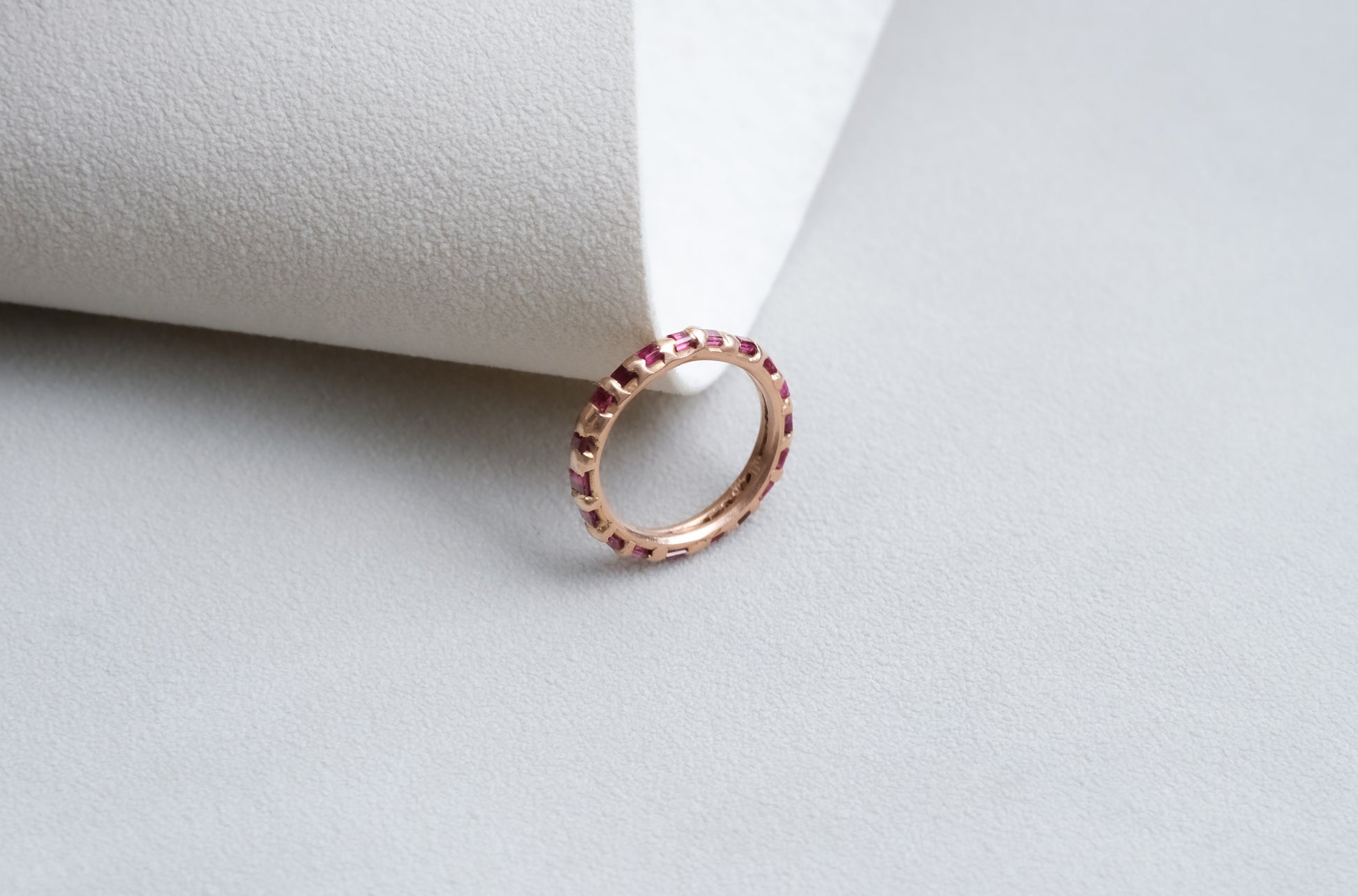 Eternity rings are exquisite symbols of eternal love, as they feature a seamless band of precious gemstones encircling the entire ring. This eternity ruby ring, crafted with gorgeous rubies embedded onto an 18k rose gold band, showcases an astonishing color palette.