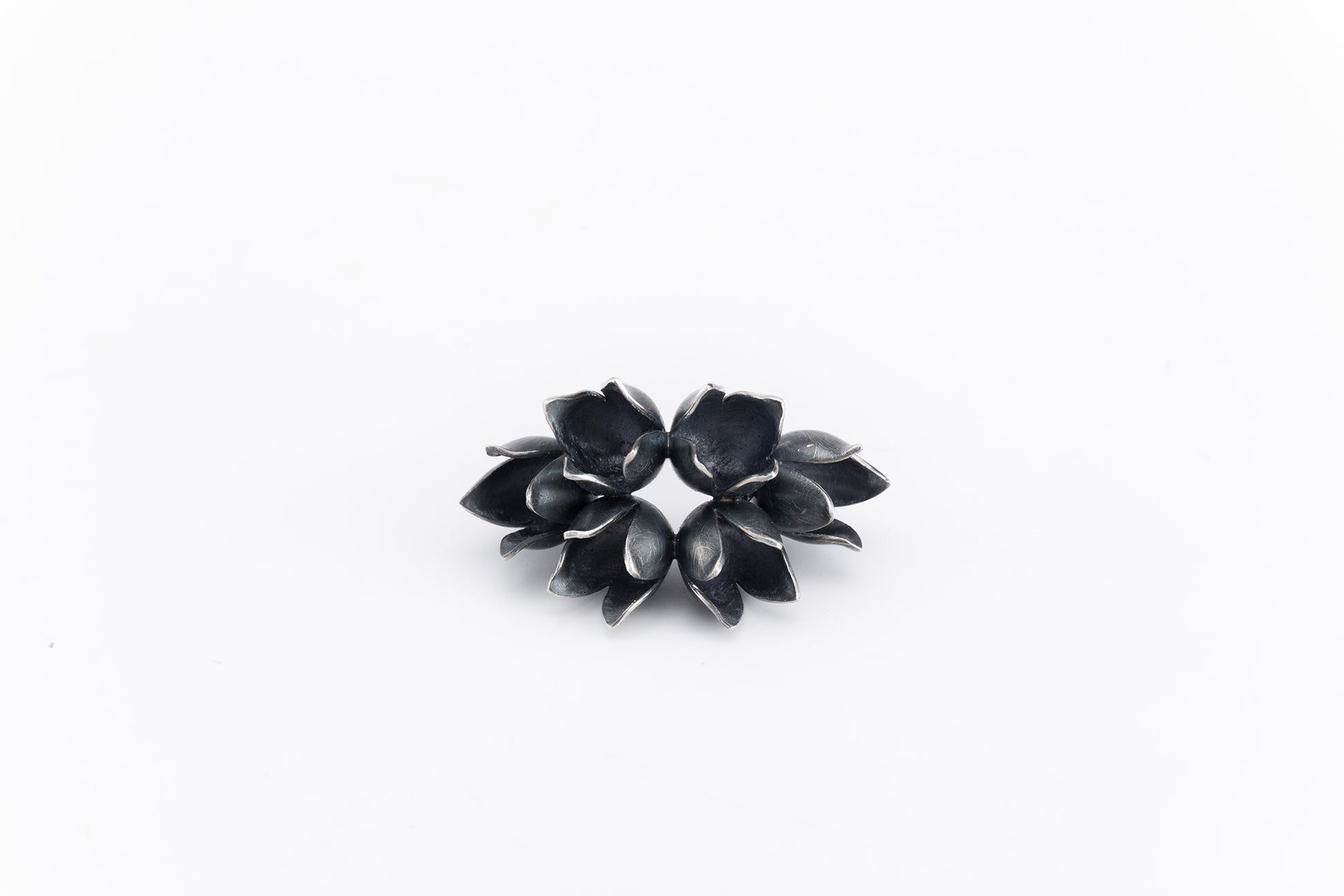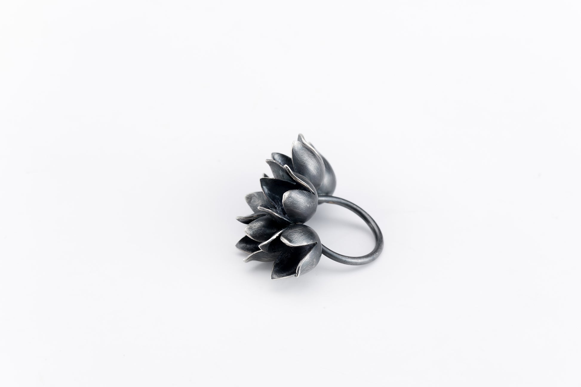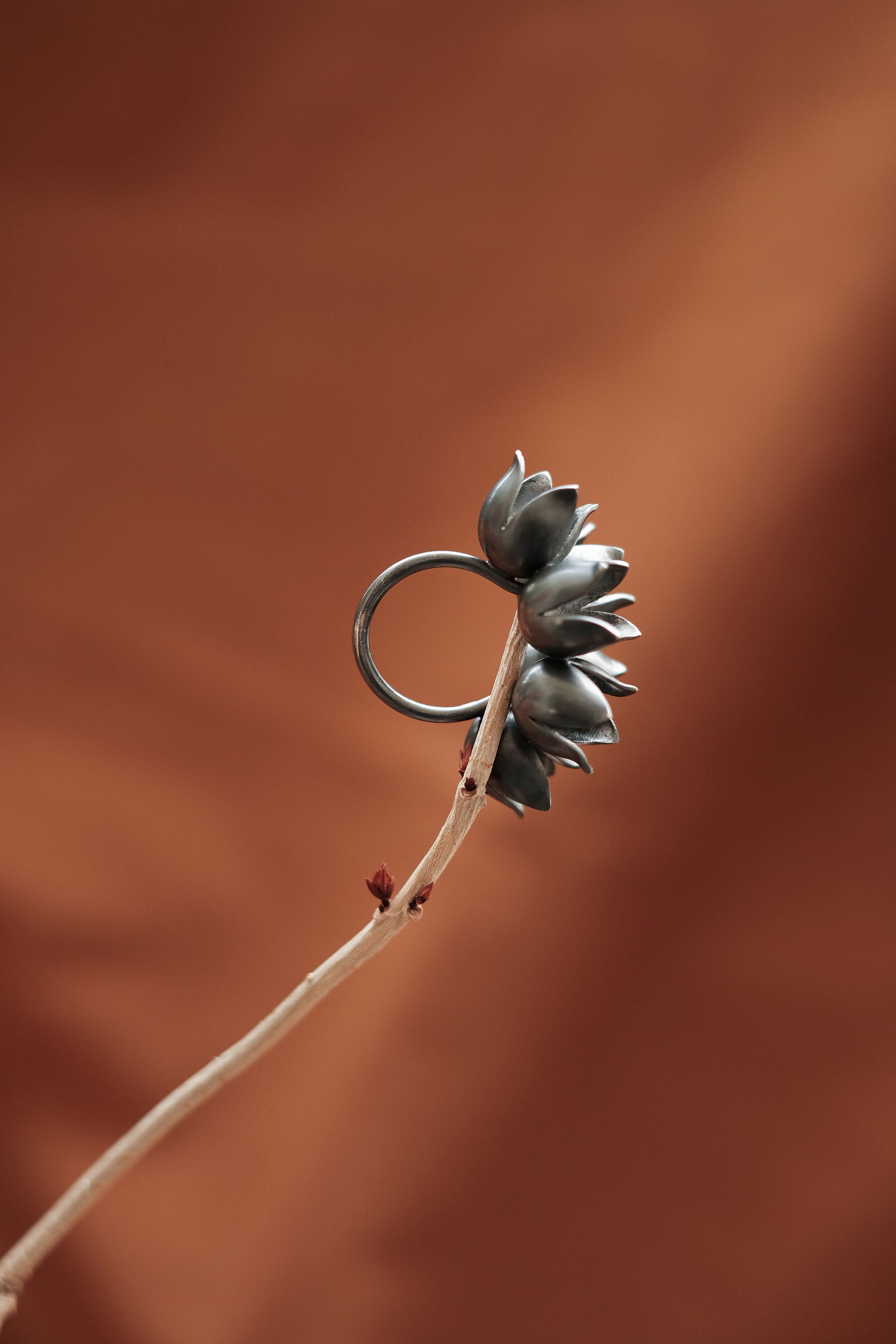 This ring translates delicate blossoms into lasting sculptures.Blooming in shades of grey, who could resist having this magnificent bouquet of flowers nesting atop their fingers?