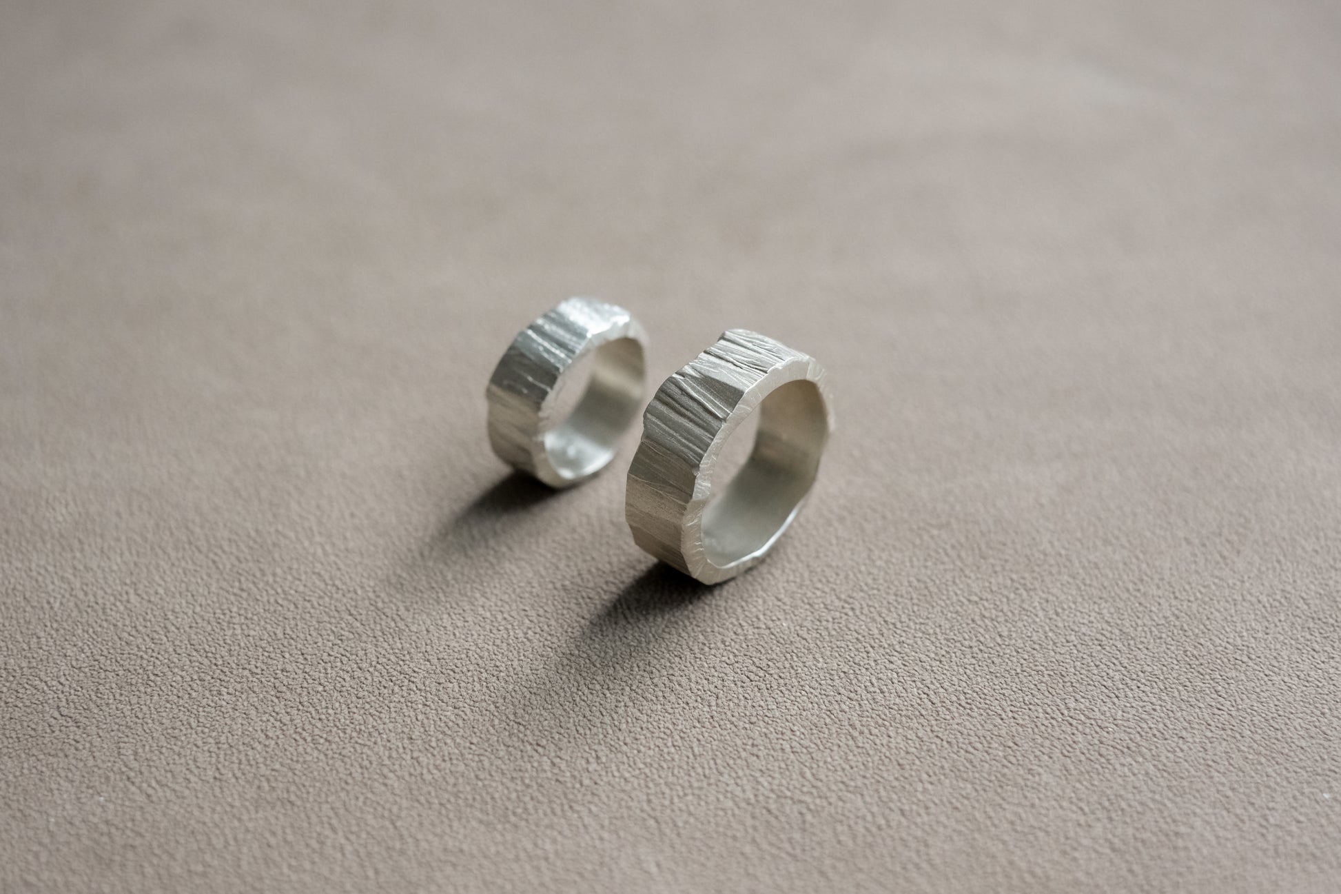 An exploration of textures and surfaces, Belinda Chang takes inspiration from rock formations and textures found in plants to create this bold series or rings.