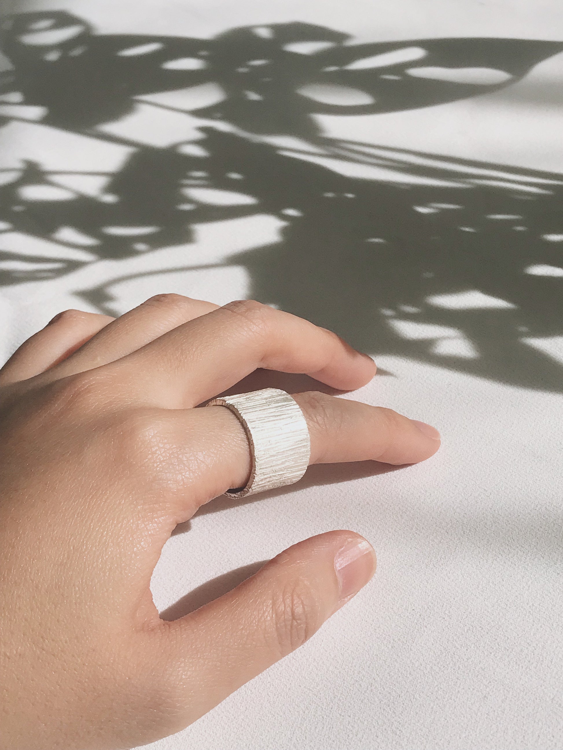 An exploration of textures and surfaces, Belinda Chang takes inspiration from rock formations and textures found in plants to create this bold series or rings.
