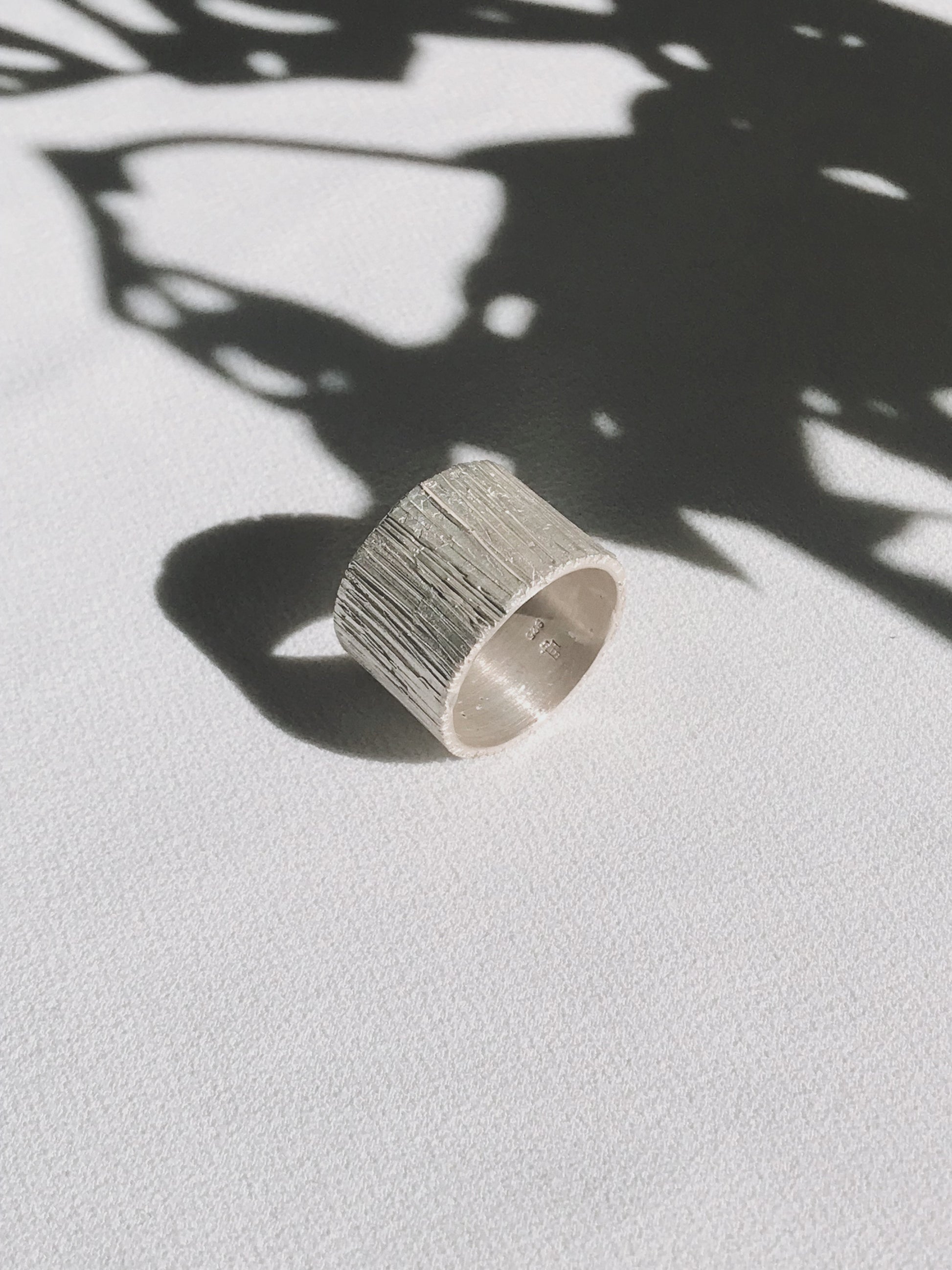 Embellished all around with straight lines, each groove is engraved by hand, leaving a hint of organic quality in an otherwise mundane composition.