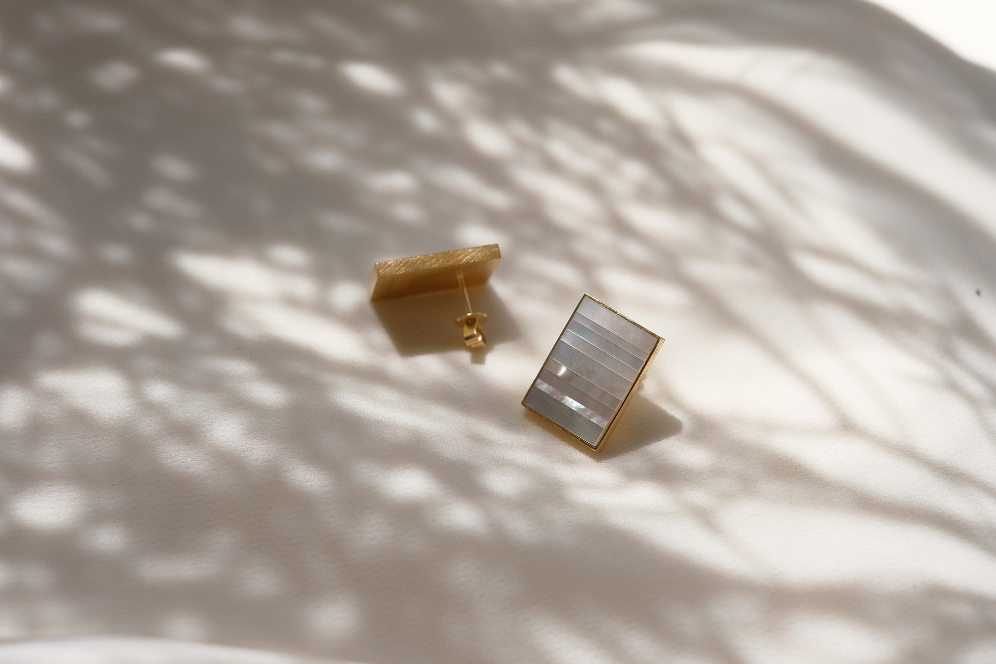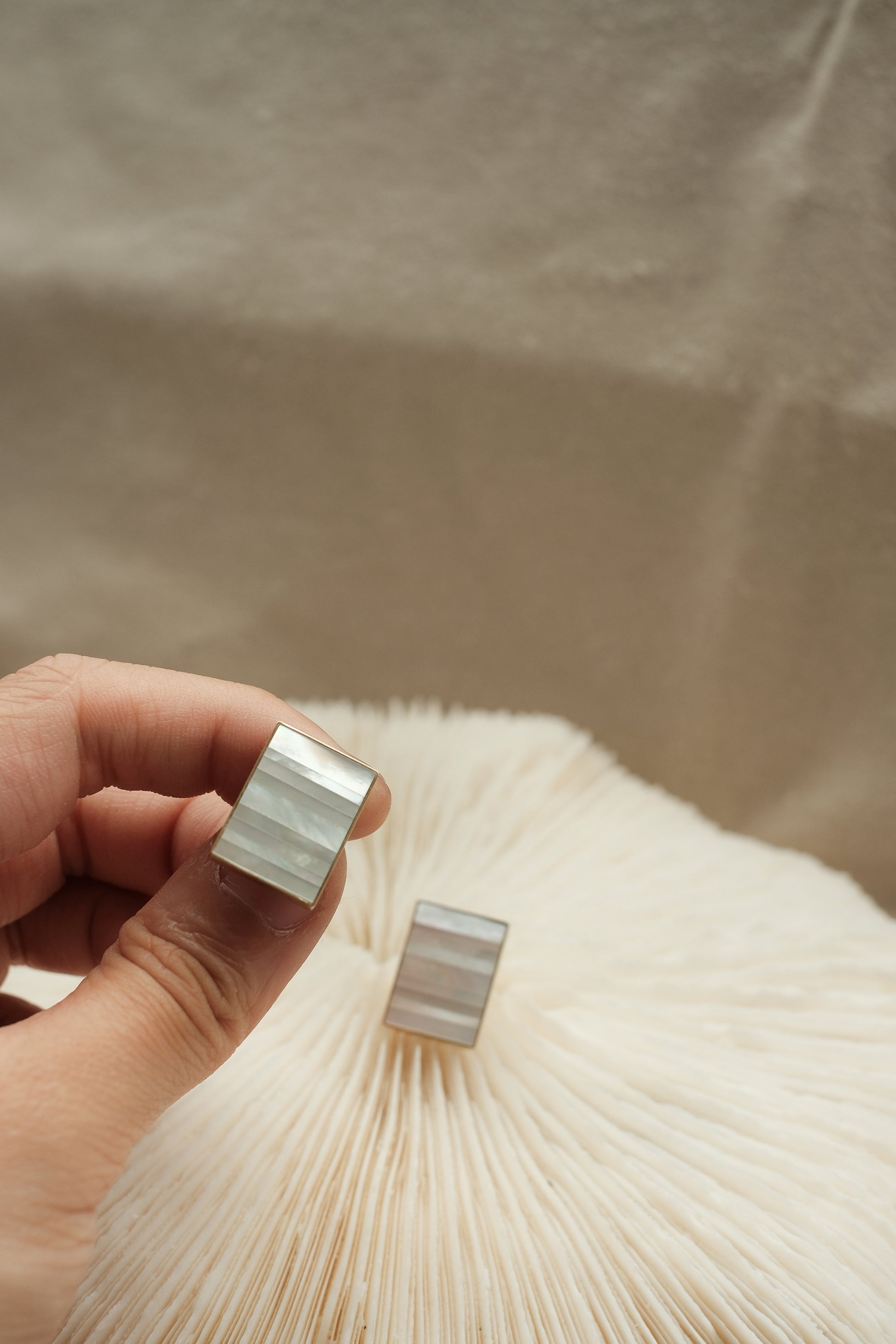 The soft lustre of mother of pearl gives this collection its signature charisma. Set on 14k gold frames, the finely polished nacre gems give off a dreamy iridescence.