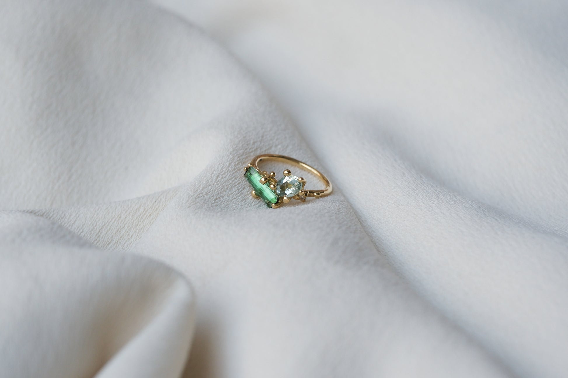 A carefully curated palette gives this ring its fiery undertone. Scattered granules and precious stones in varied cuts are meticulously pieced together to form this chromatic cluster. The sublime lustre of aquamarine and green tourmaline takes centre stage in the company of an 18K white gold band.