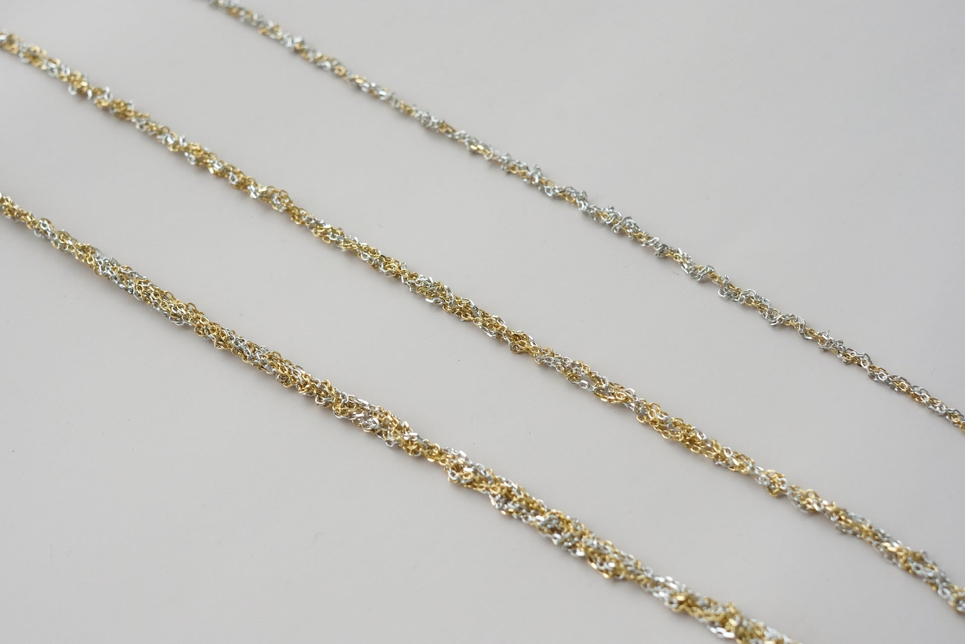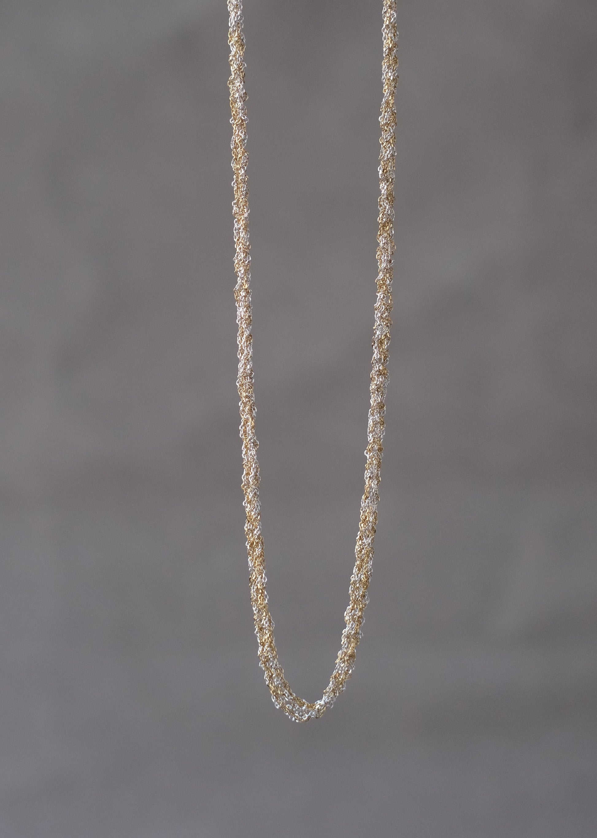 Of all things tangled, only this necklace can abide with such grace. The subtle tones of silver and gold are intertwined into knots and braids, creating a unique, organic silhouette around the neckline.