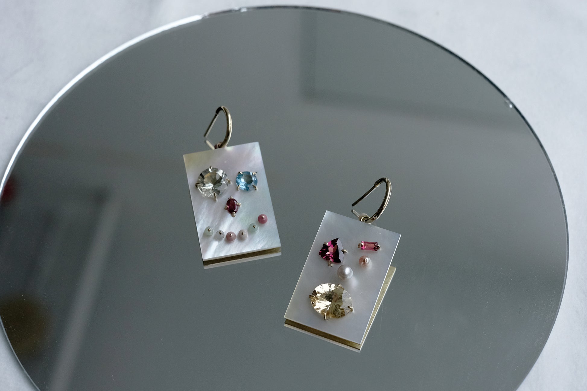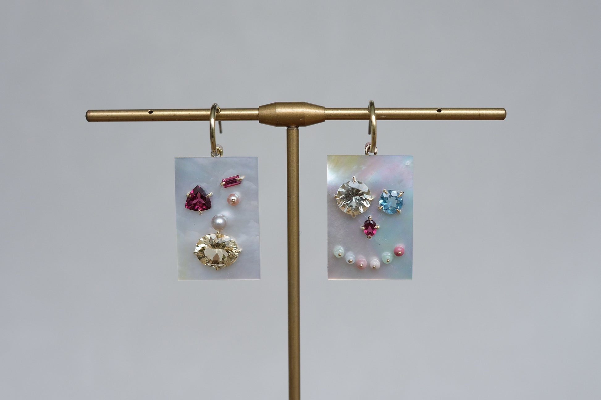 Left- pearl, 0.14ct pink tourmaline, 0.88ct almadin, 2.5ct golden beryl