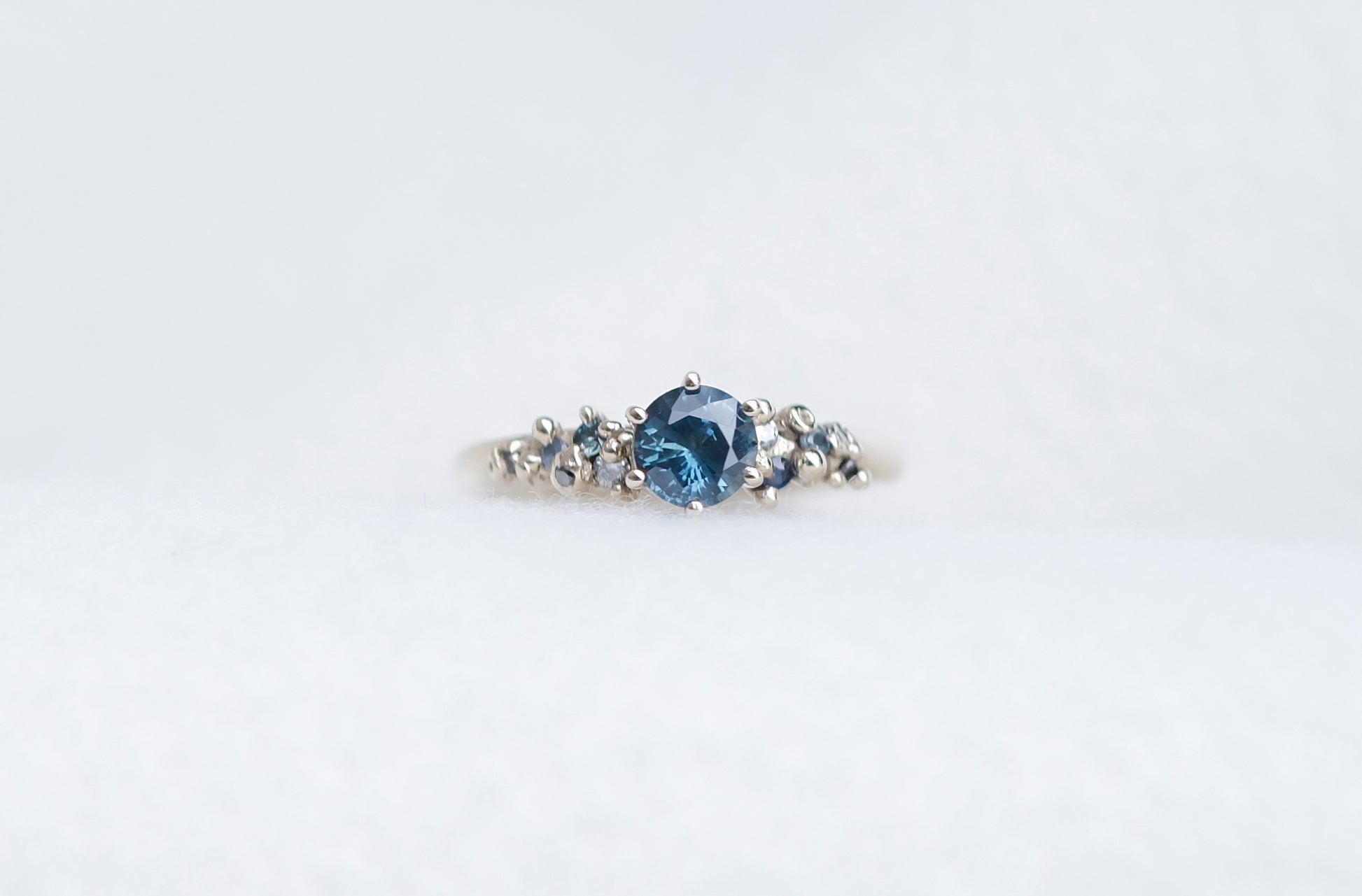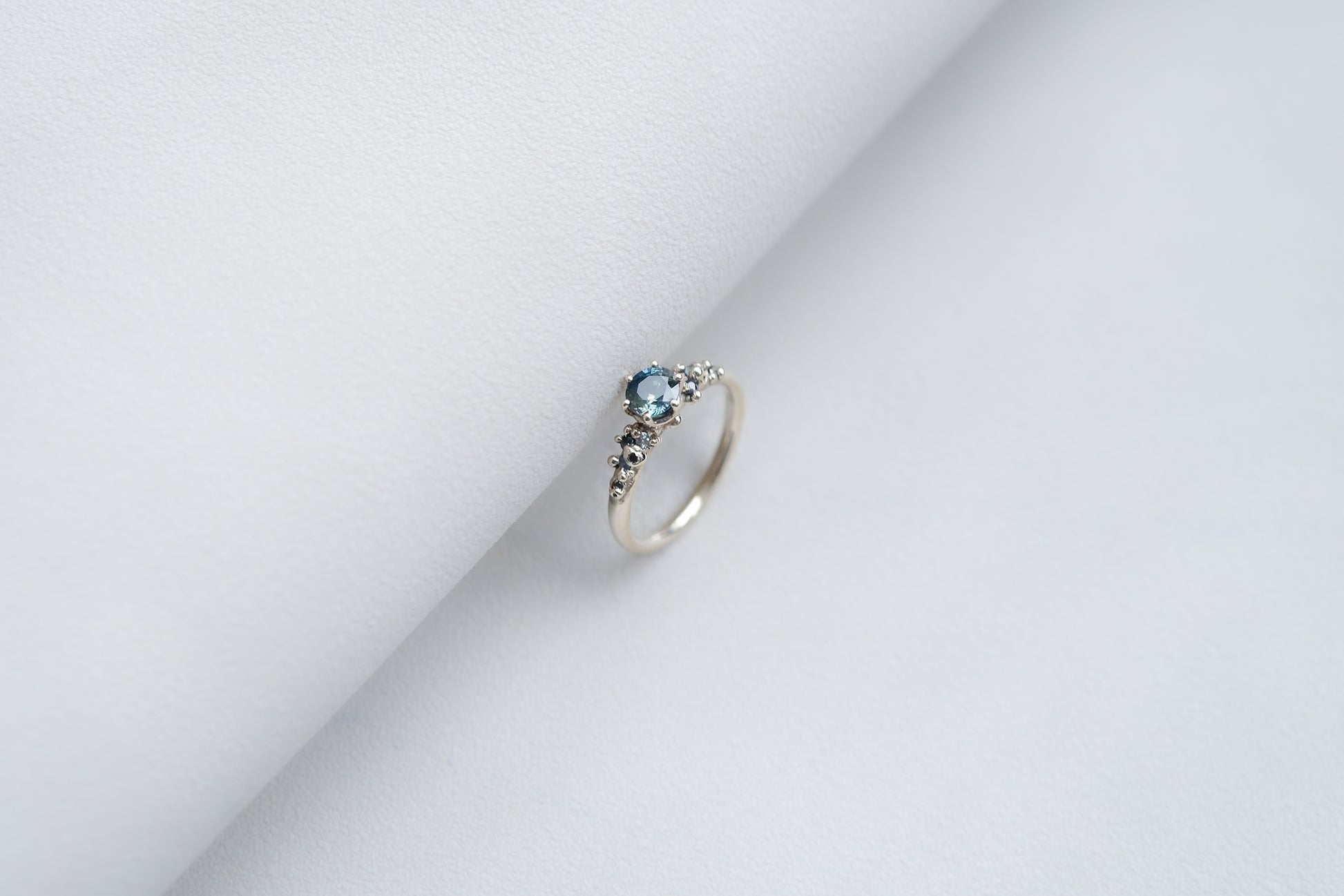 Material: 0.5ct teal sapphire, blue sapphires with white and black diamonds in 18K white gold