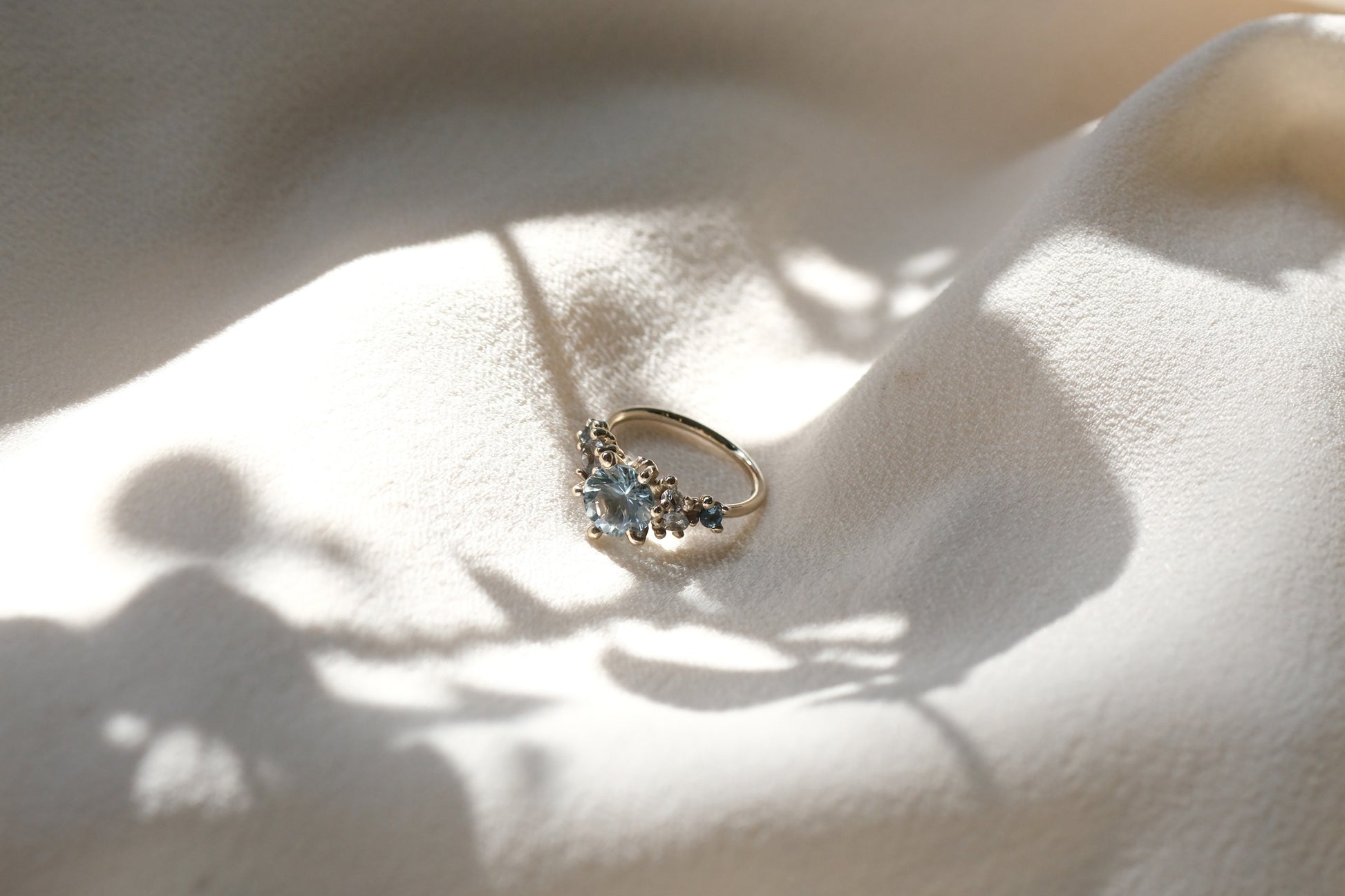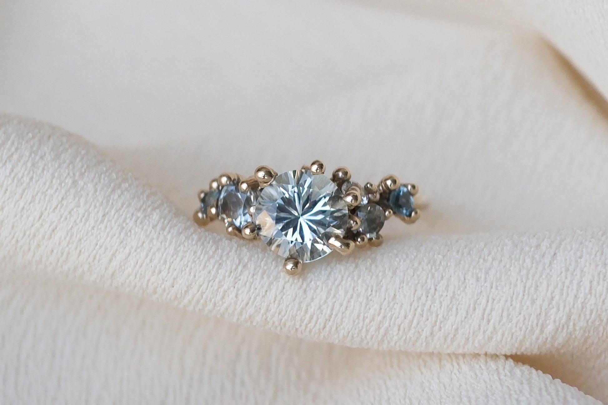 A carefully curated palette gives this ring its fiery undertone. Scattered granules and precious stones in varied cuts are meticulously pieced together to form this chromatic cluster. The sublime lustre of aquamarine, topaz takes centre stage in the company of an 18K white gold band.