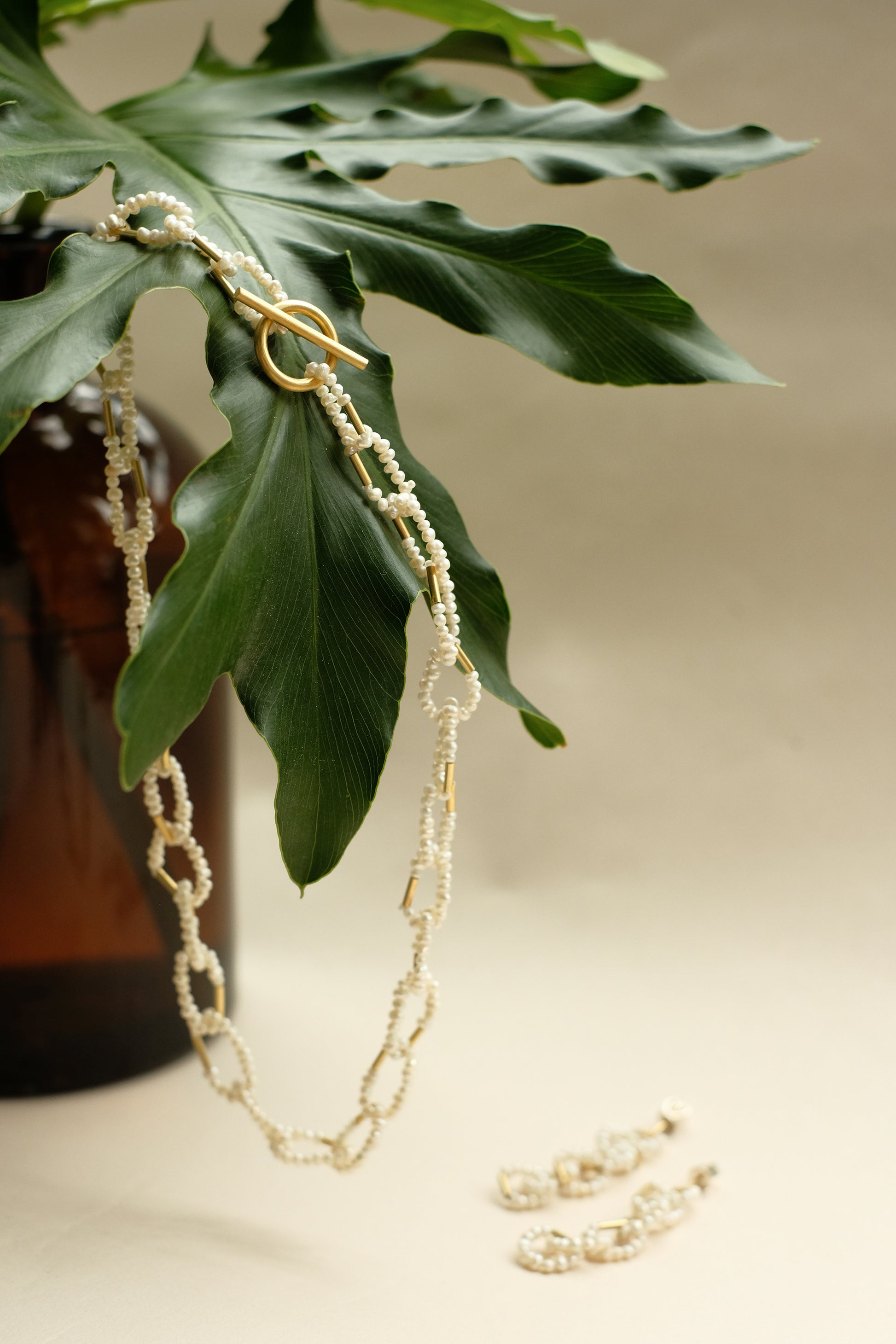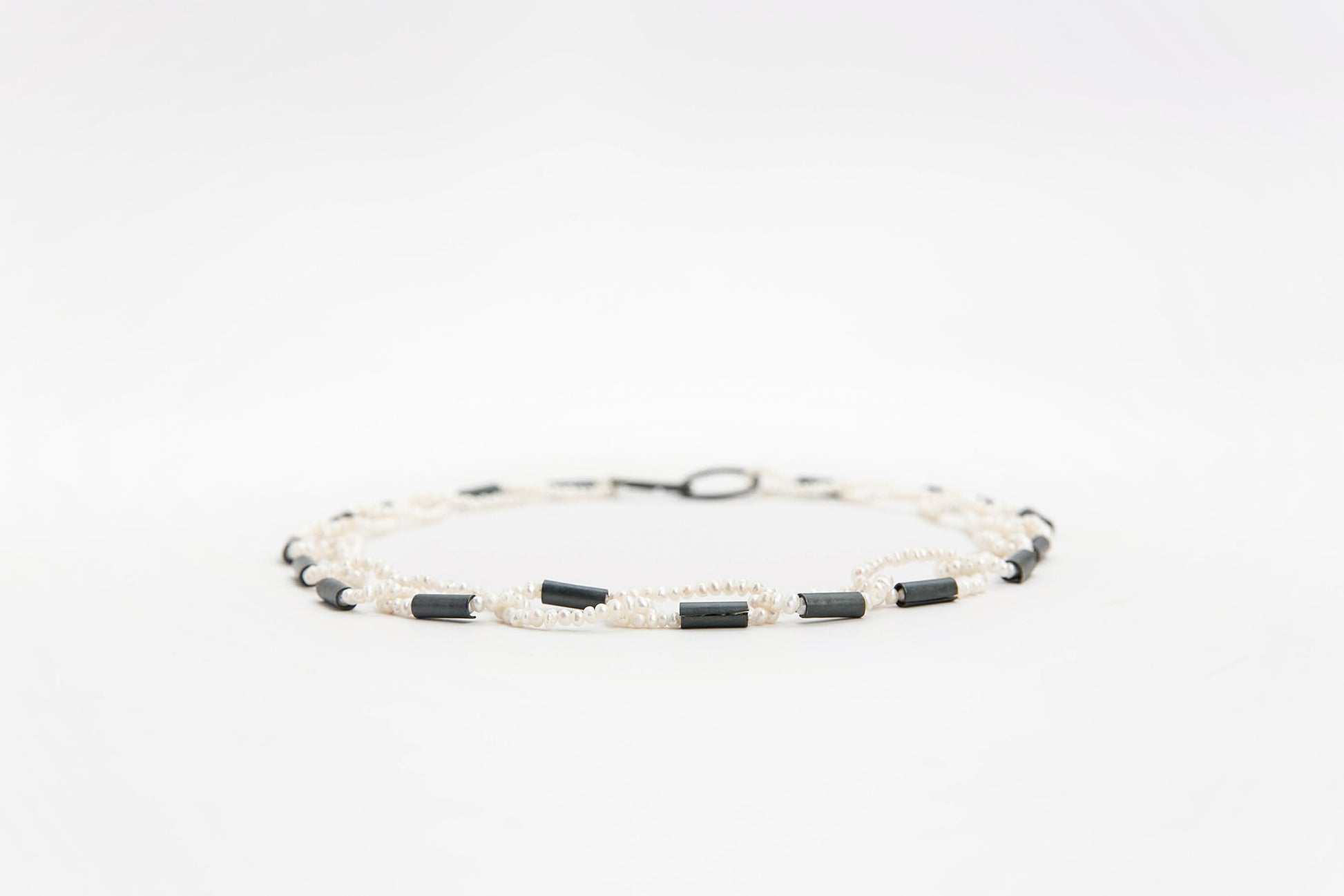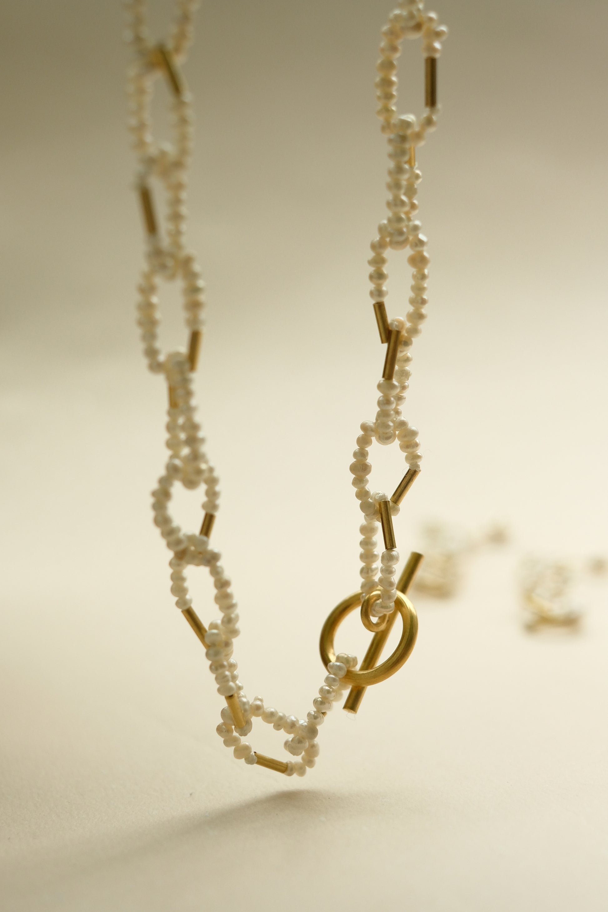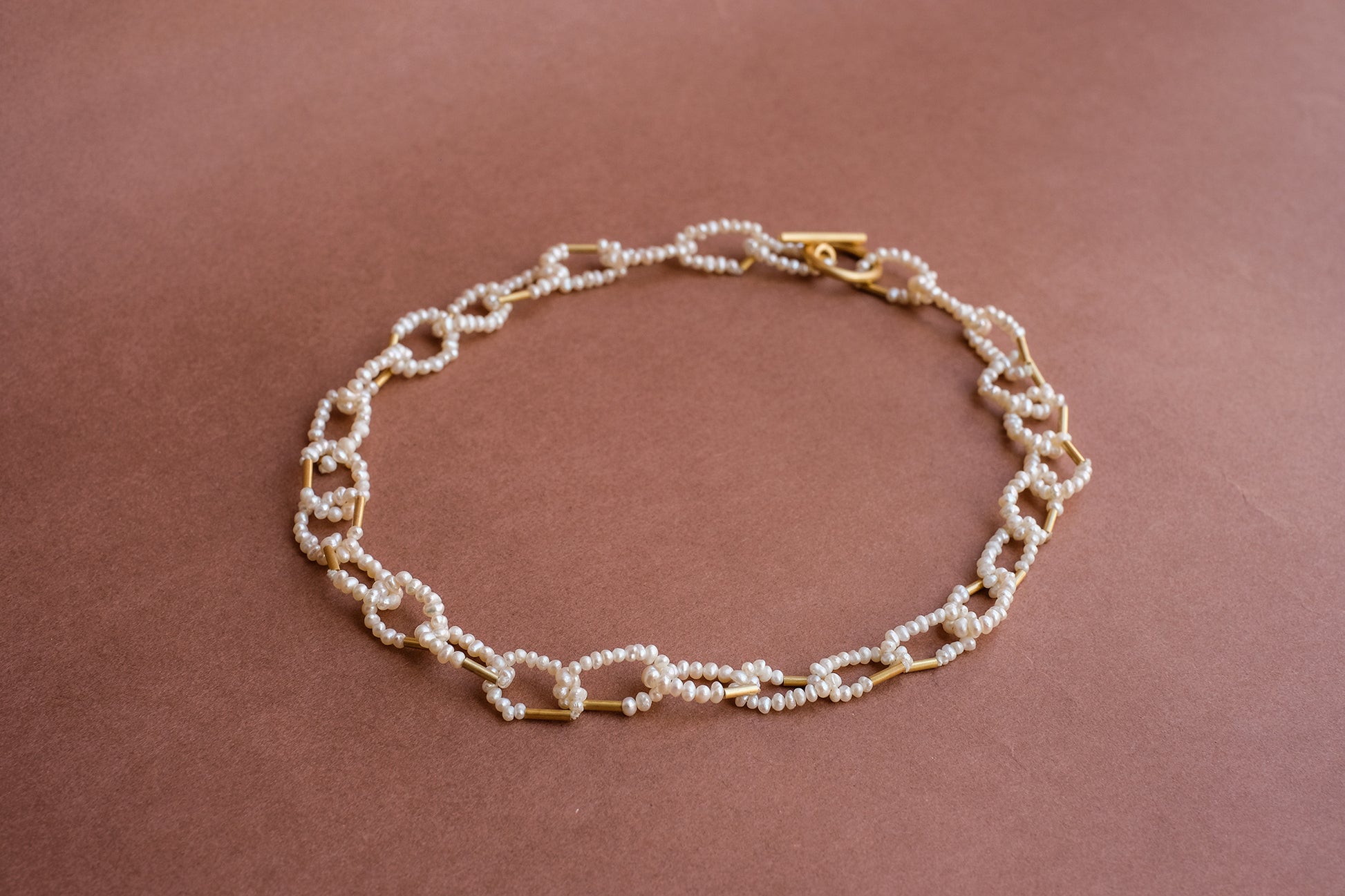 Material: seed pearls, 18K yellow gold-plated or oxidised silver tubes and clasp