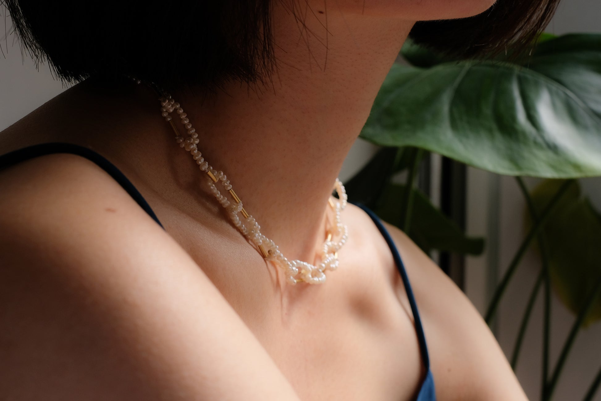 A tribute to modest beginning of all pearls, and the oysters that gave us them, this collection stars the rarely featured baby pearls. Interlocking hoops of baby pearls threaded with gold plated silver tubings as embellishment, creating a charmingly sophisticated aesthetic.