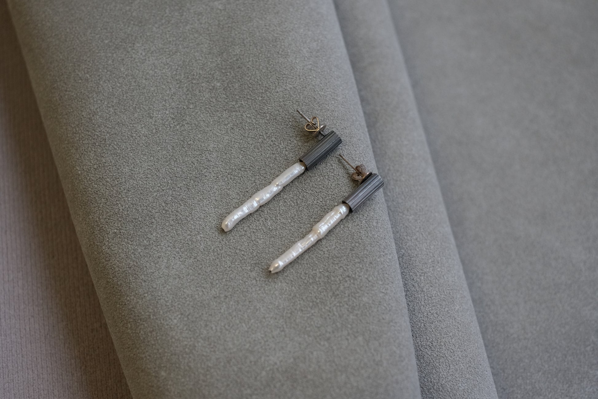 A ridged rim of sterling silver, reminiscent of a stem is brought to an abrupt end, below it hangs a pearl-carved dew. Captured in a delicate position, the pearl shivers and swings to every movement of its wearer.