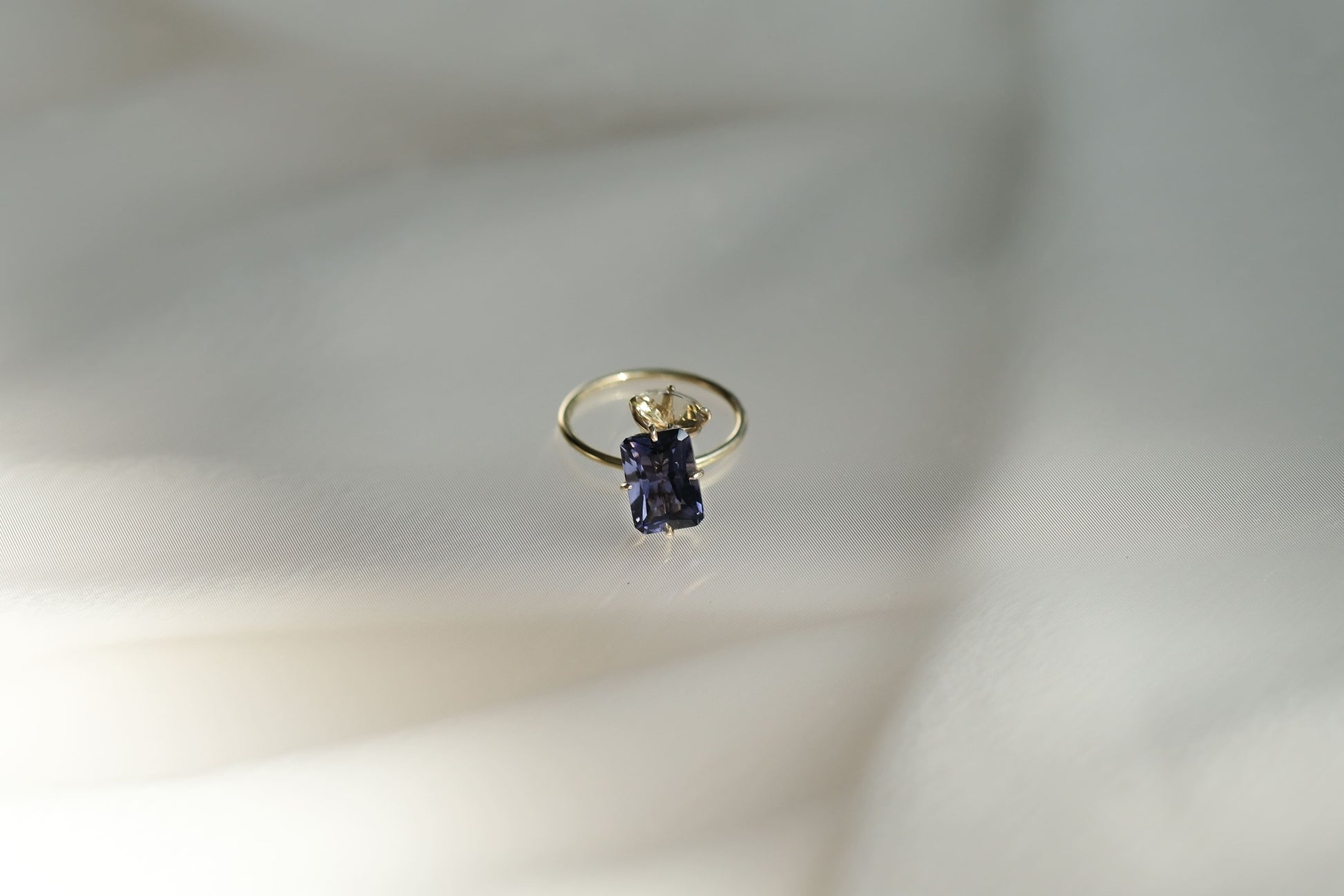 A radiant dance of light and color, this ring from the Pirouette Collection highlights the harmonious pairing of Purple Iolite and Yellow Beryl. Set on an 18k gold band, the gemstones are ingeniously designed to move gently, capturing the beauty of fluid motion and creating a kaleidoscope of hues as they shift and glimmer.