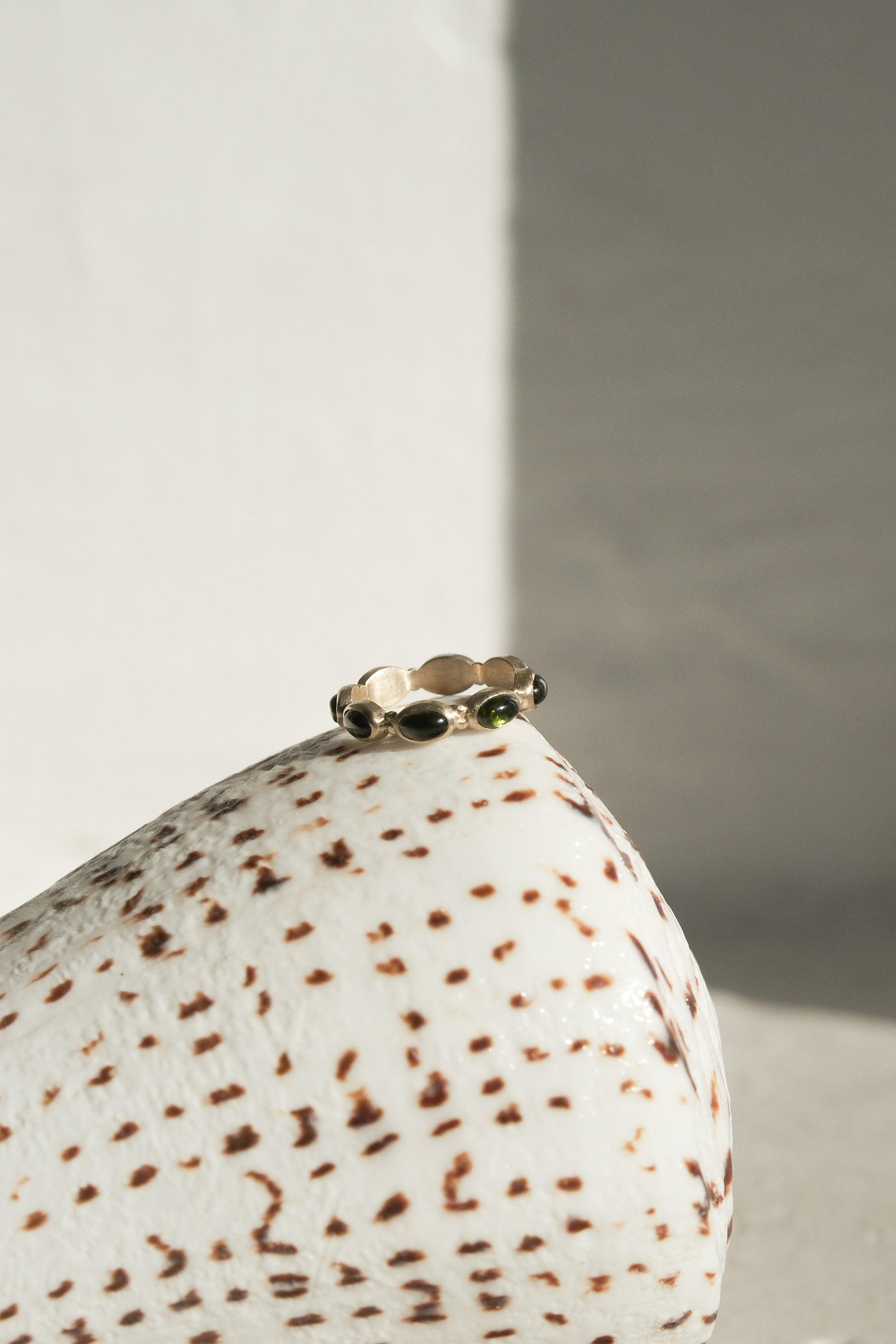 A graceful piece from the Renaissance Series, this eternity band speaks of understated sophistication. Composed of 18k gold, it features a continuous line of oval-cut green tourmalines, each carefully set to form a seamless loop. The vibrant hues of the tourmalines harmonize beautifully with the warm glow of gold, creating a timeless design that exudes subtle luxury.