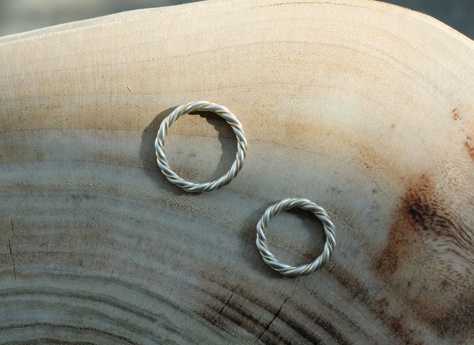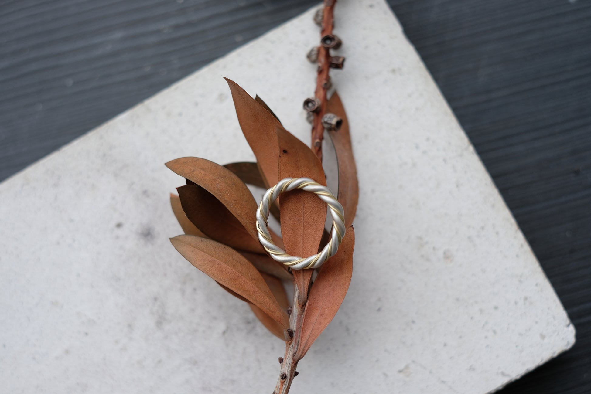 This design takes a simple metal-smithing technique, and elevates it to an artistic touch of ingenuity. With twists distributed evenly across the entire ring, it creates negative space that complements with the overall design.