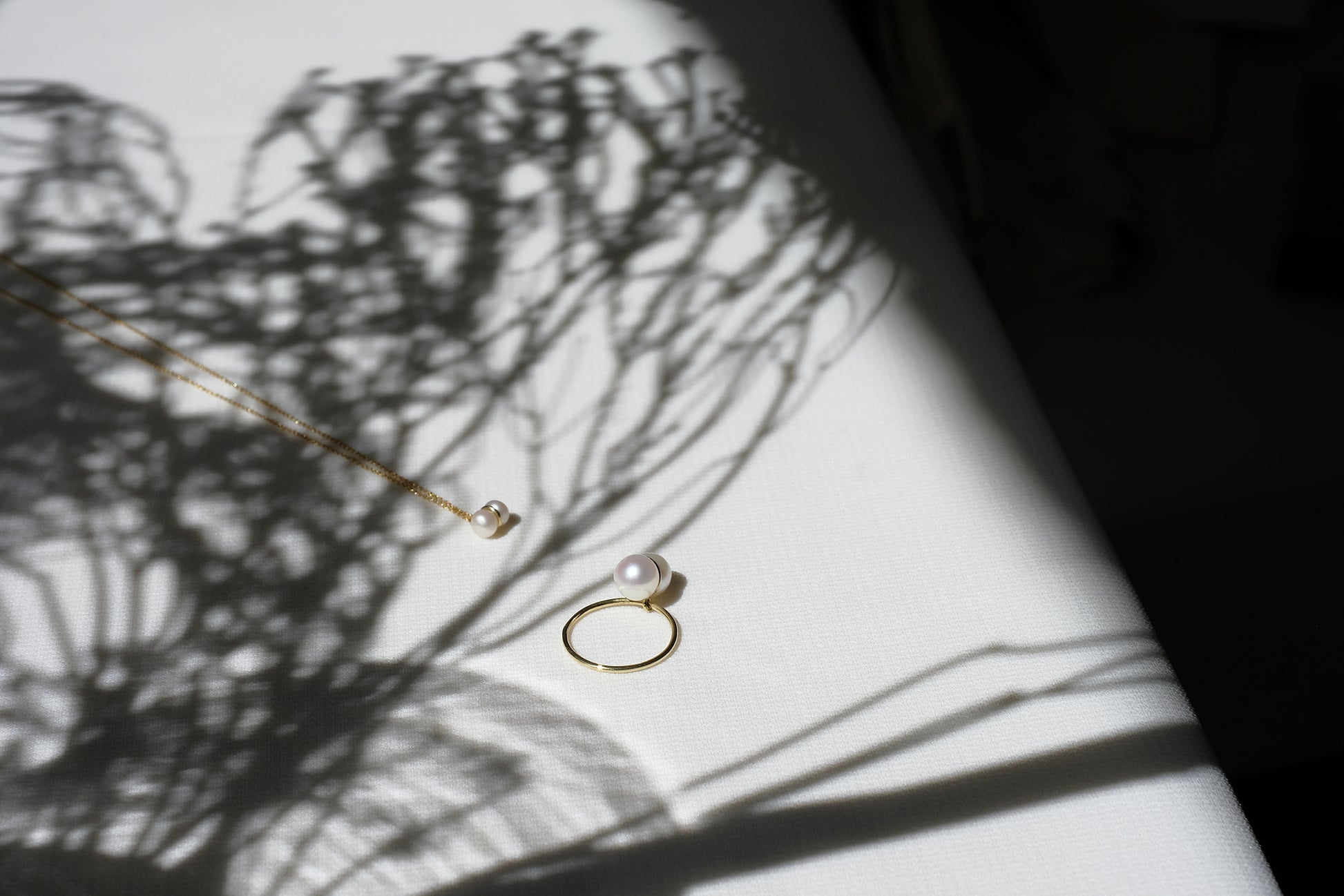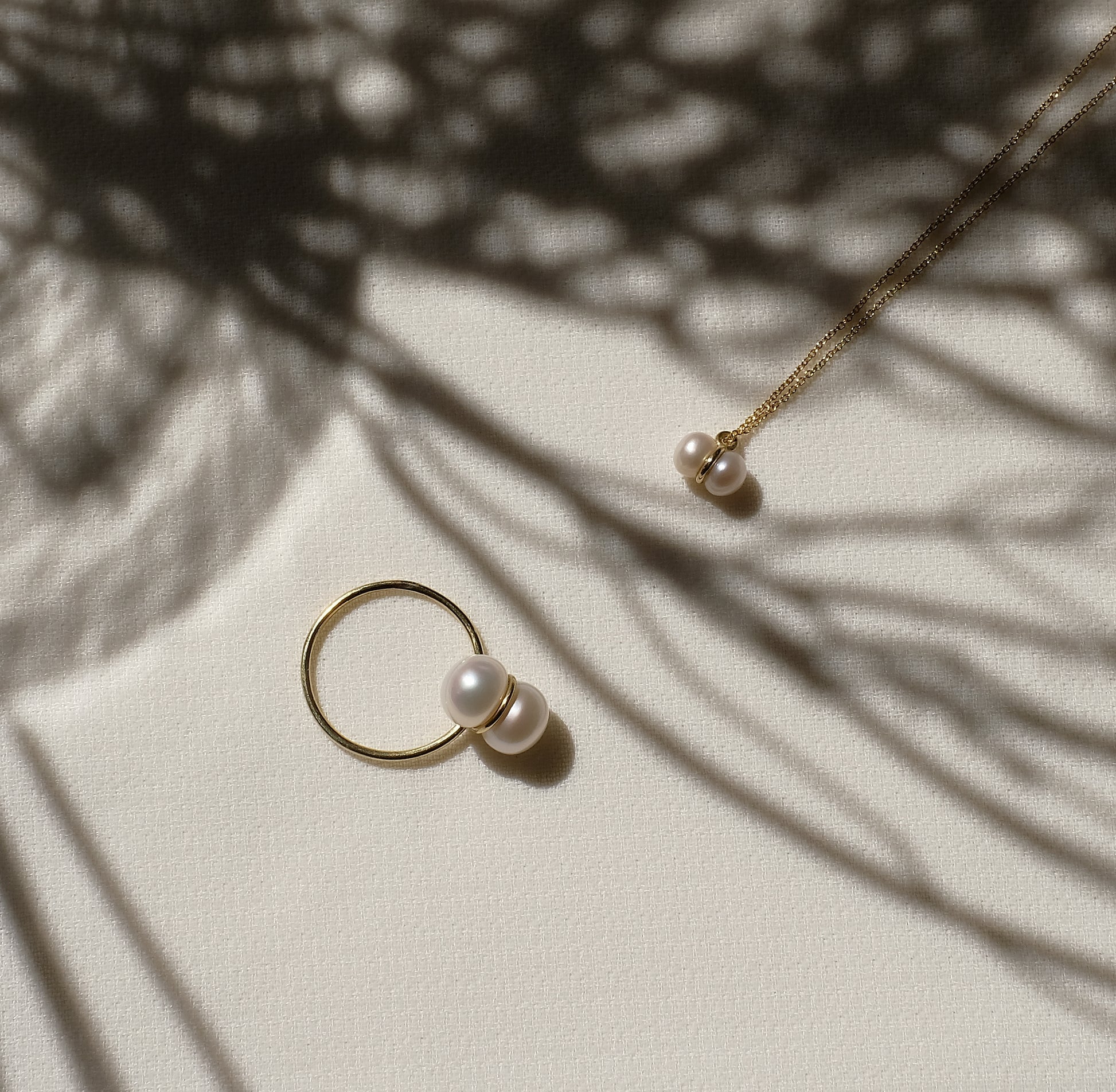 Versed in 18k gold and fresh water pearls adjoined back to back, the couple hold strong onto a ring of gleaming gold, and vow never to be set apart ever again.
