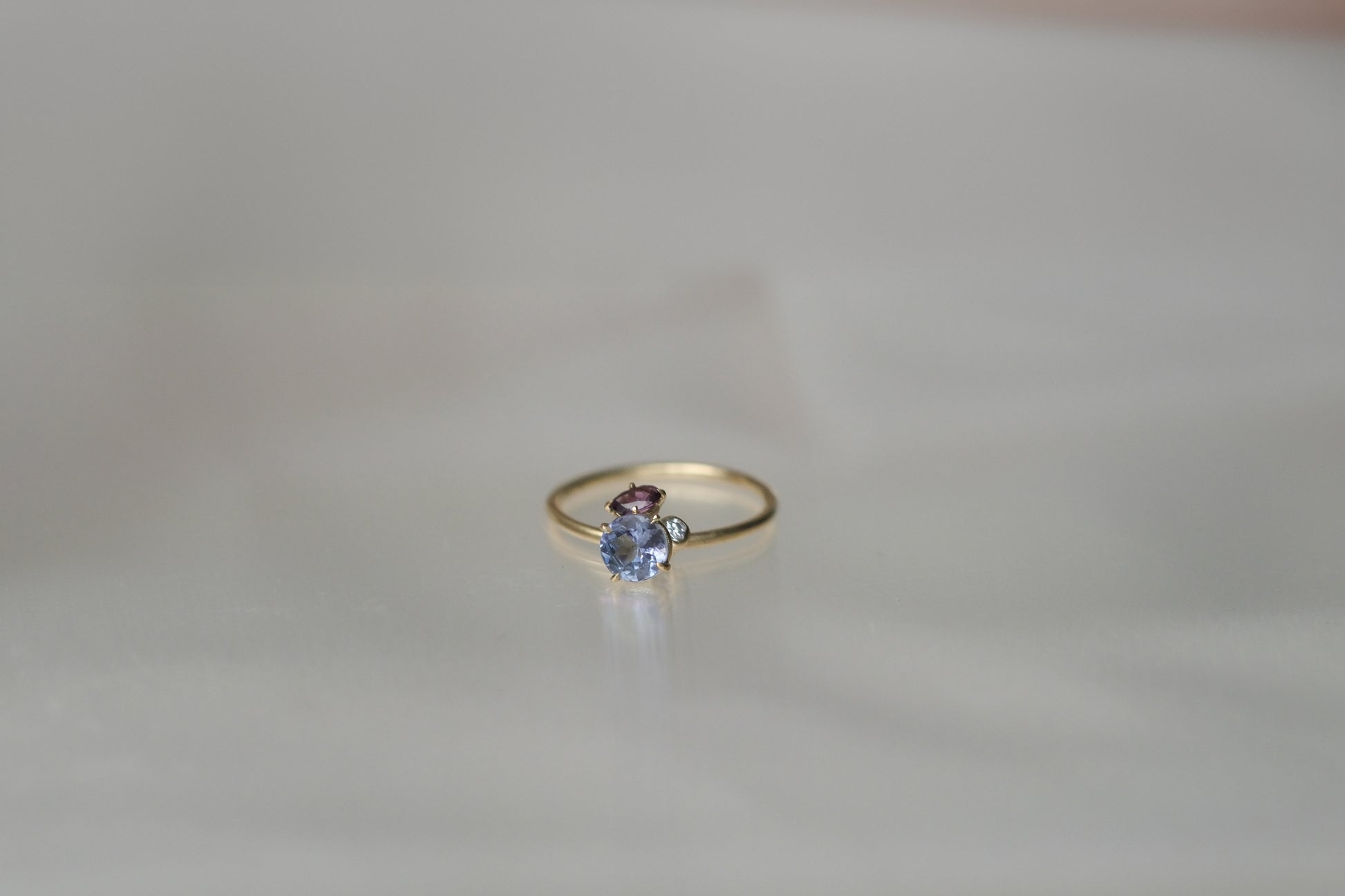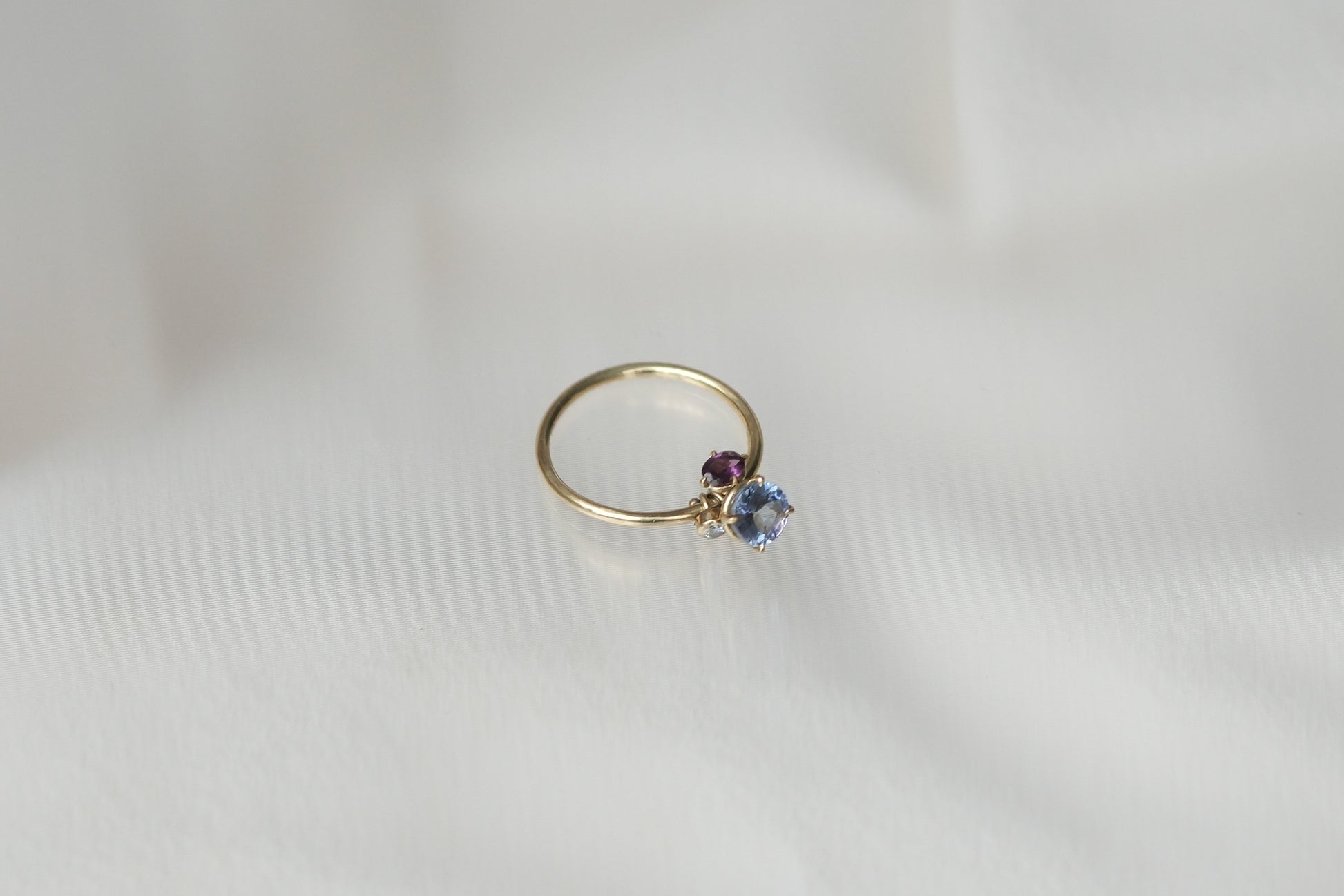 A duo of gemstones poised with perfection. Affixed to 18k gold band, the precious stones glimmers as they plié and turn with grace and control. This piece showcases how Belinda manipulate the materials to making the fullest use of their sensuous properties.