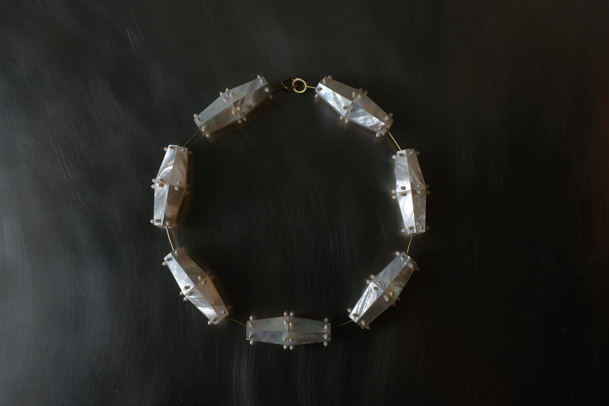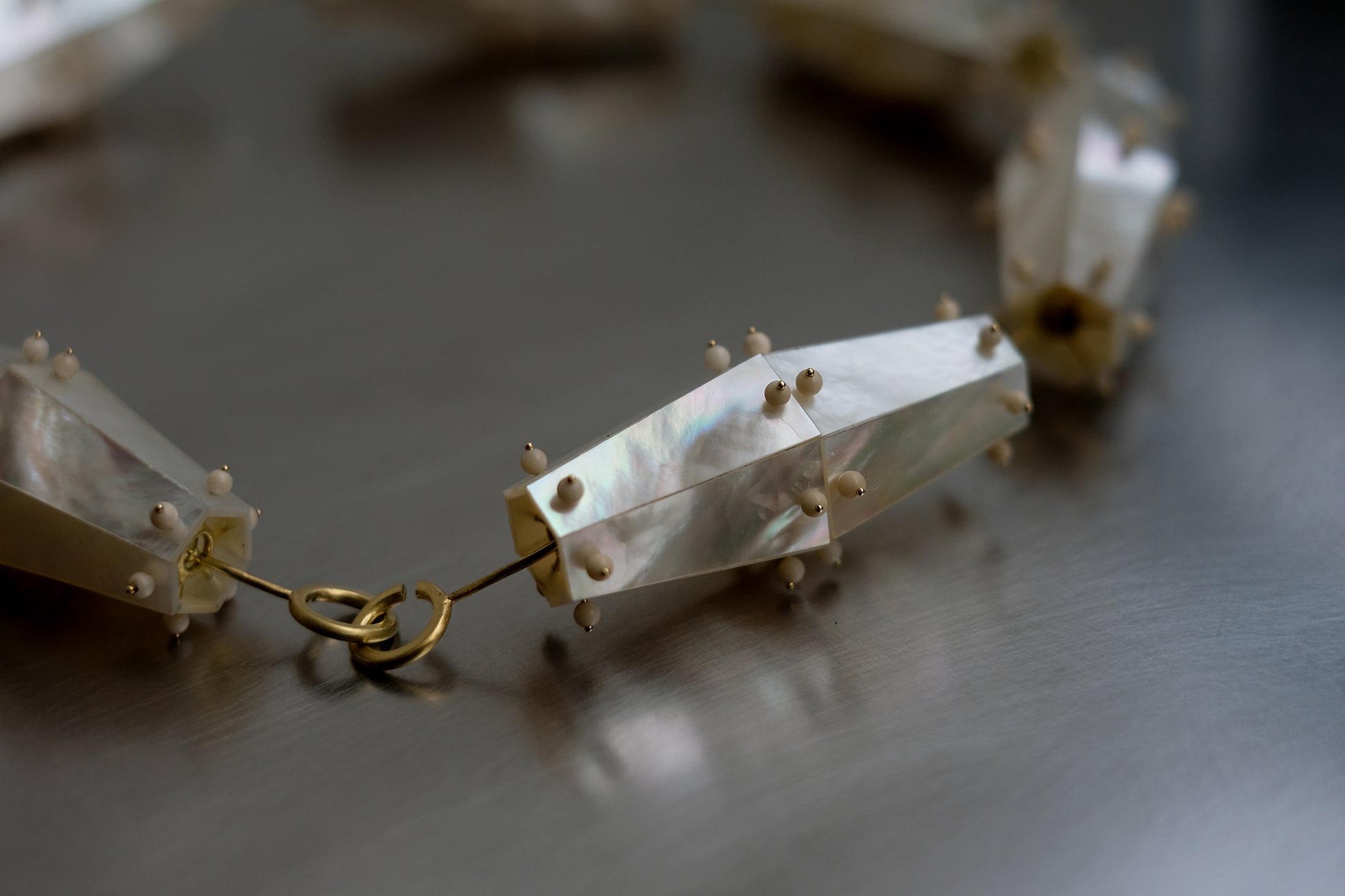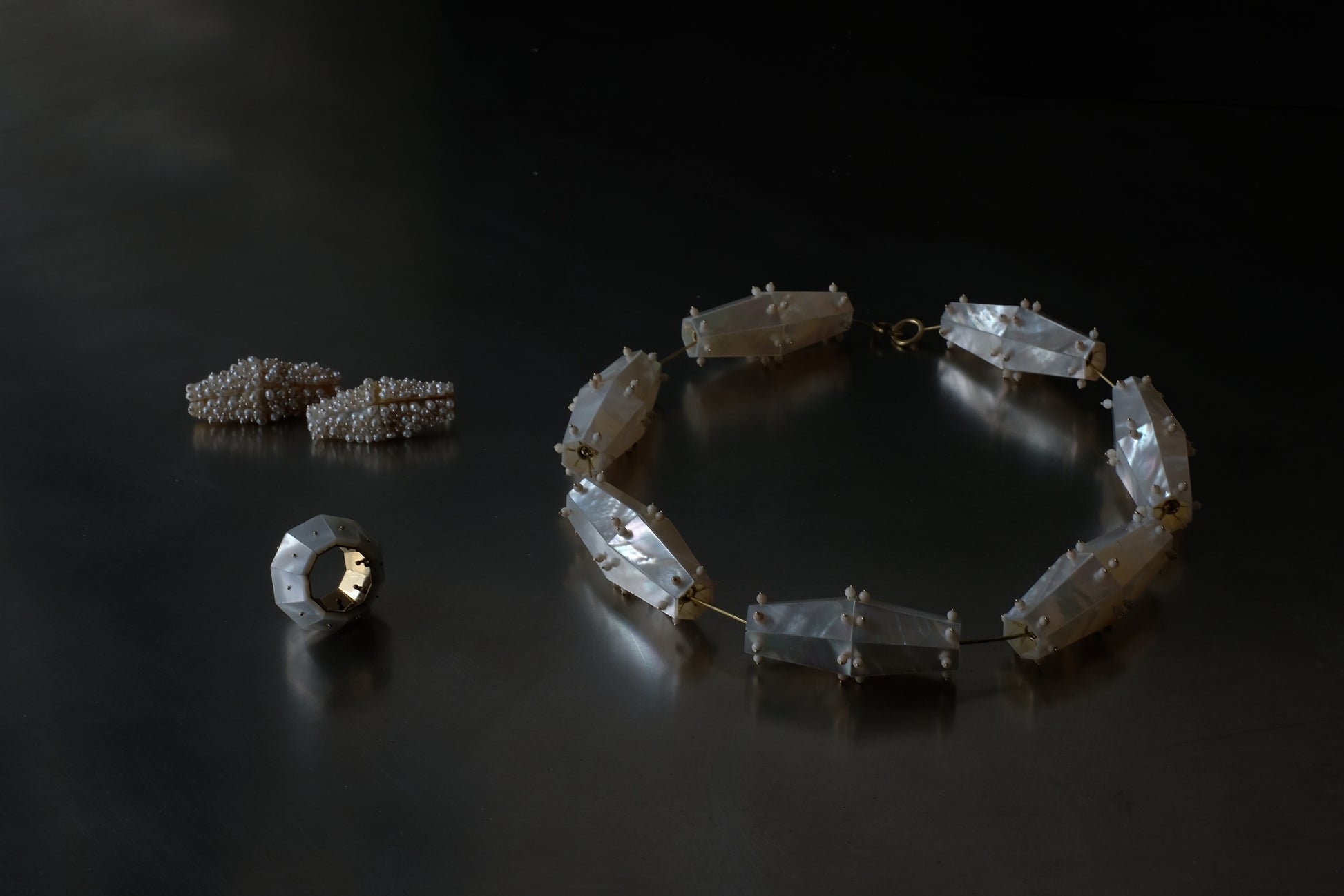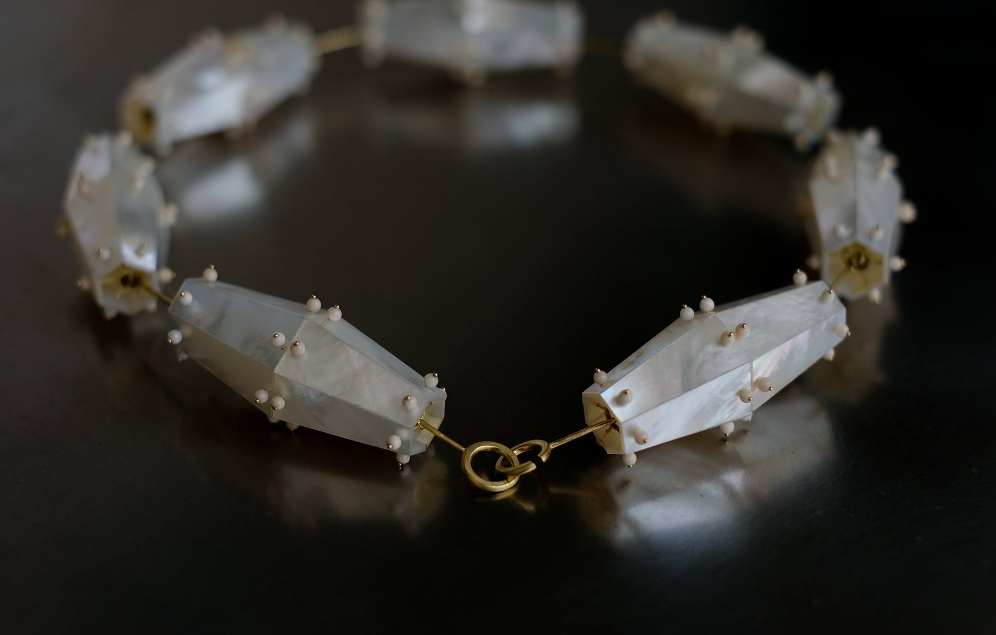 Combining handcrafted goldsmithing techniques with modern engineering precision, identical mother-of-pearl panels are meticulously arranged into precise geometrical prisms.