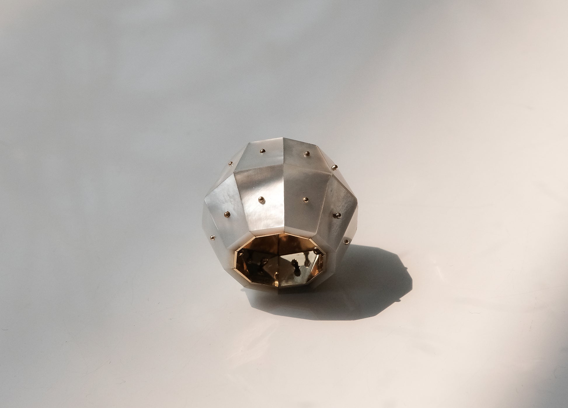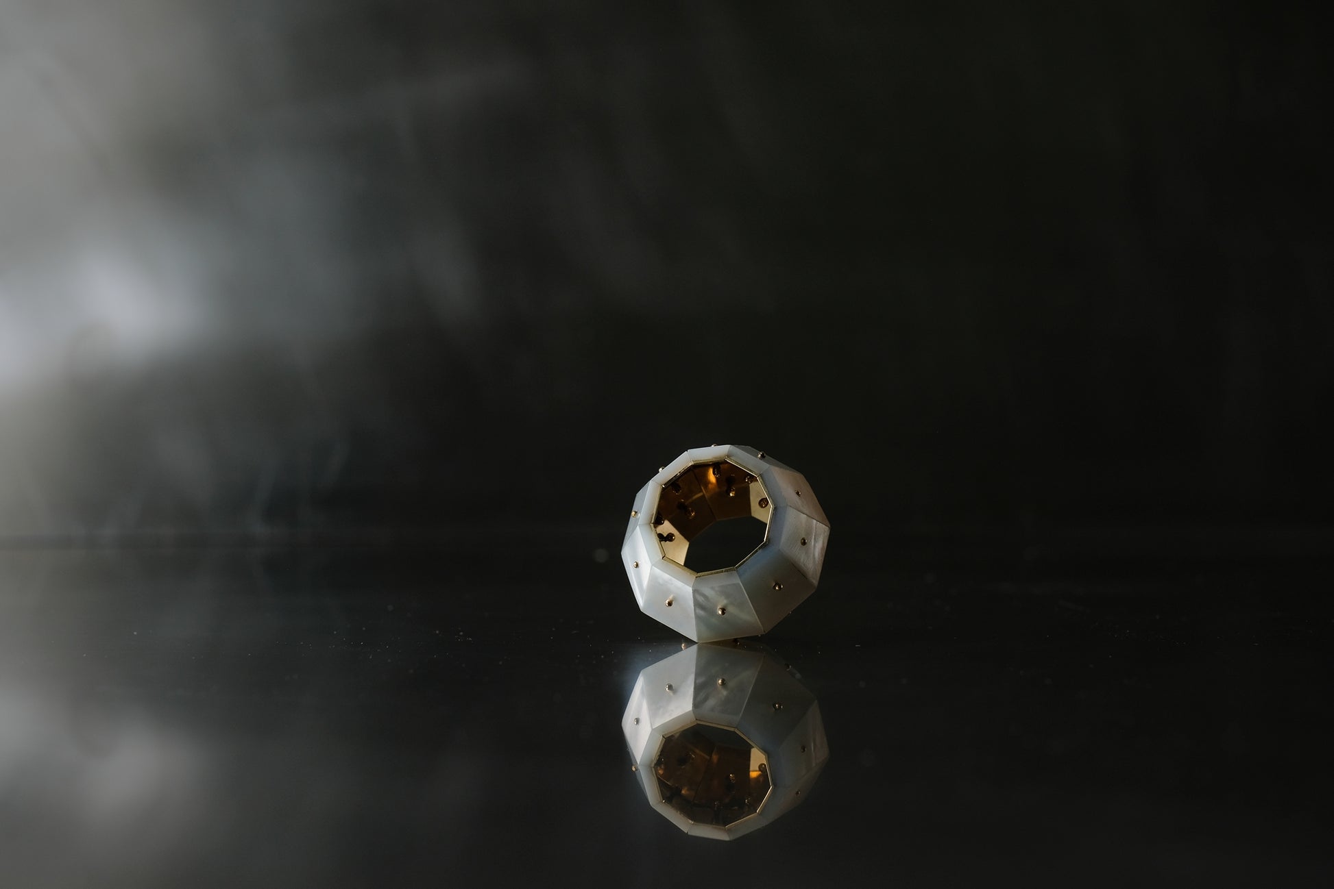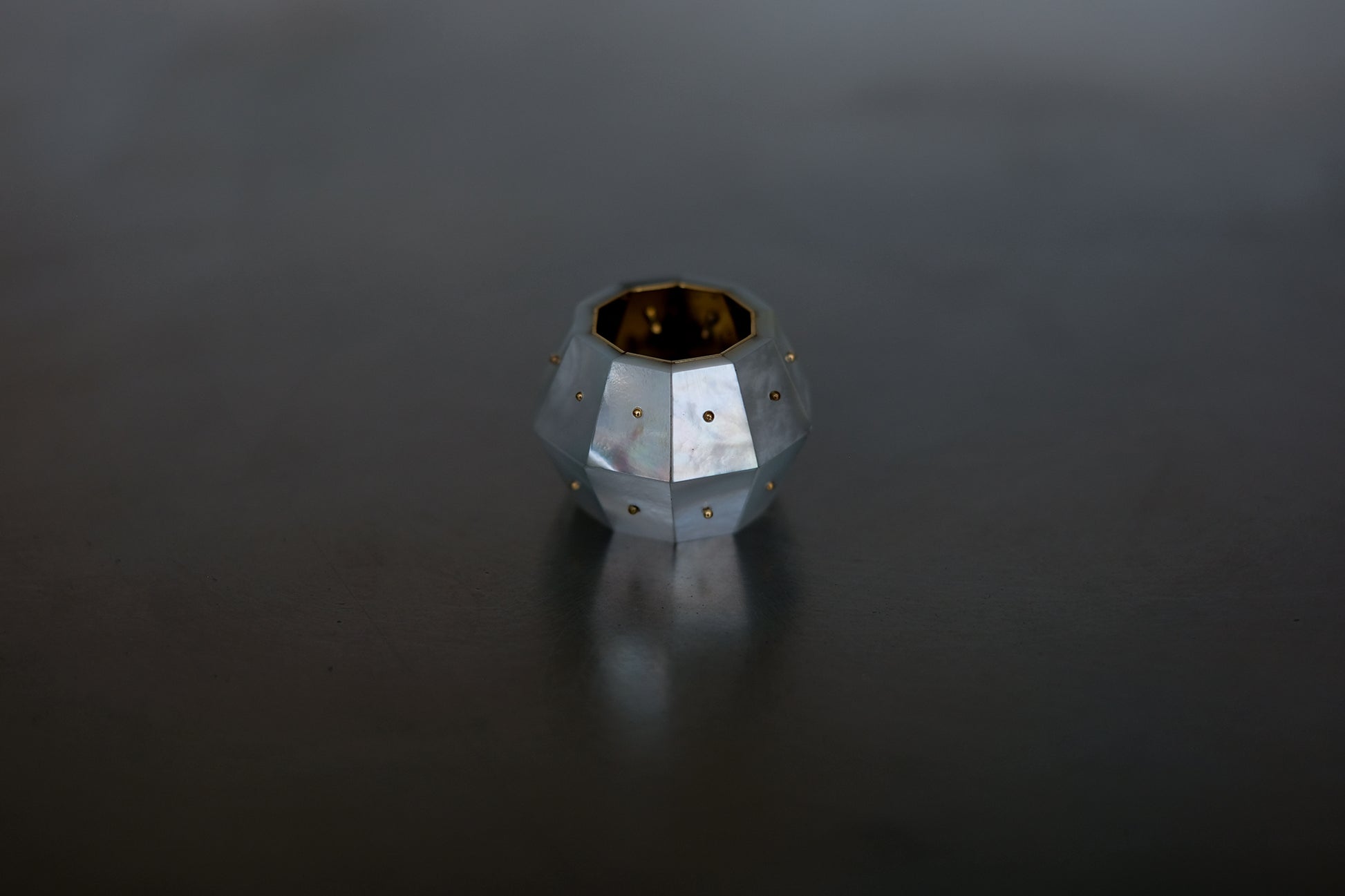 Combining handcrafted goldsmithing techniques with modern engineering precision, identical mother-of-pearl panels are meticulously arranged into precise geometrical prisms.