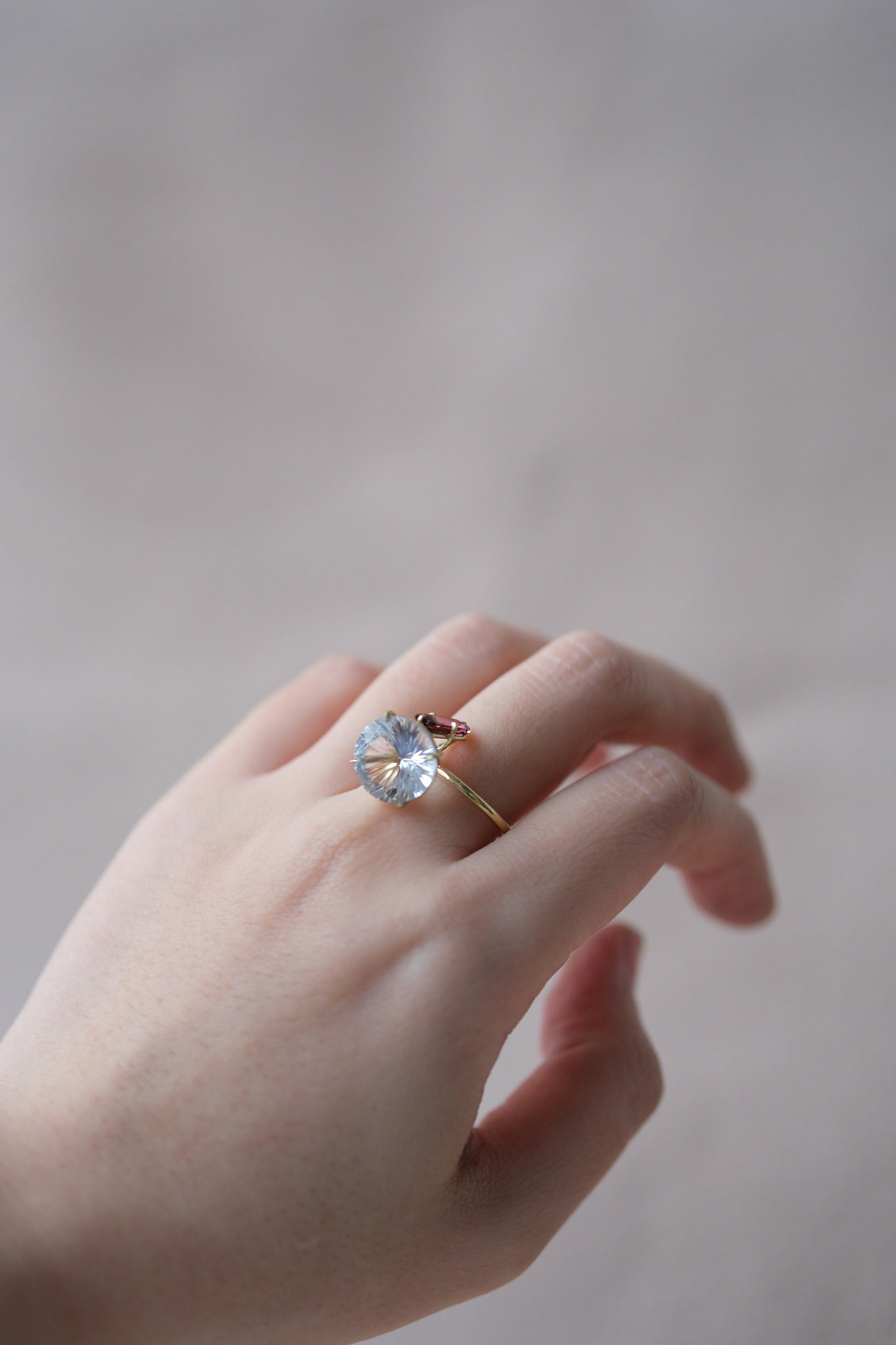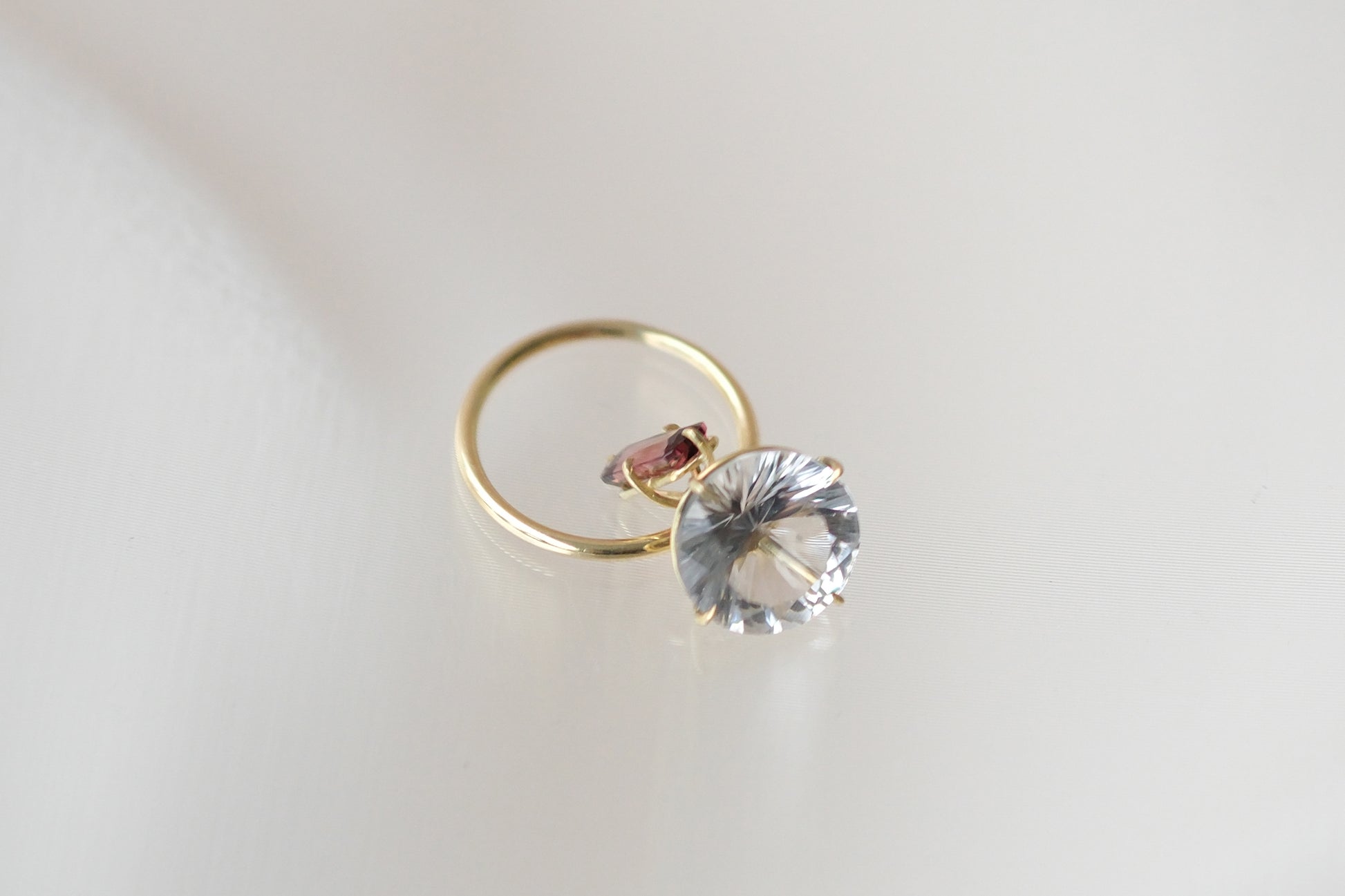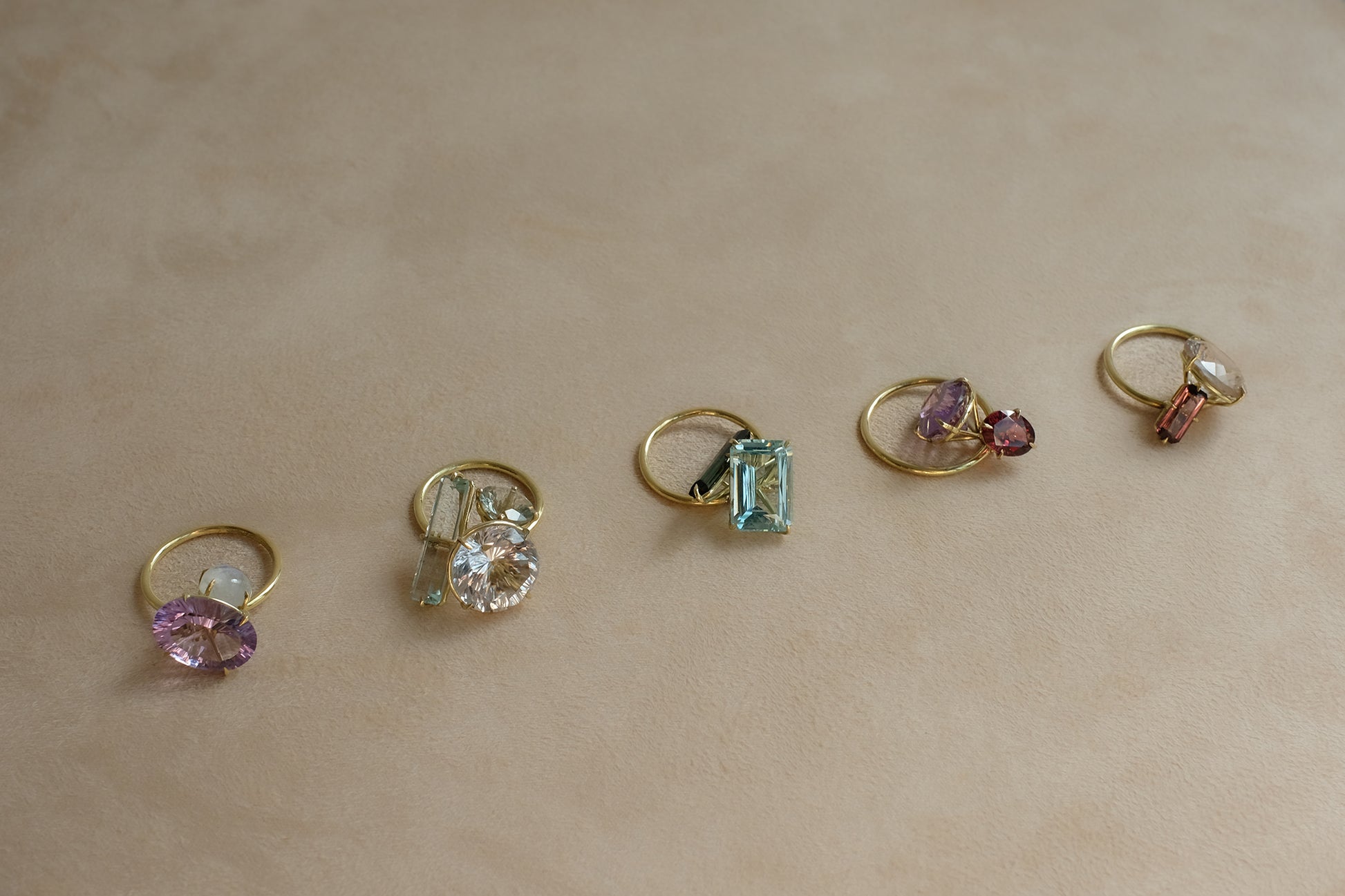 A duo of gemstones poised with perfection. Affixed to 18k gold band, the precious stones glimmers as they plié and turn with grace and control. This piece showcases how Belinda manipulate the materials to making the fullest use of their sensuous properties.