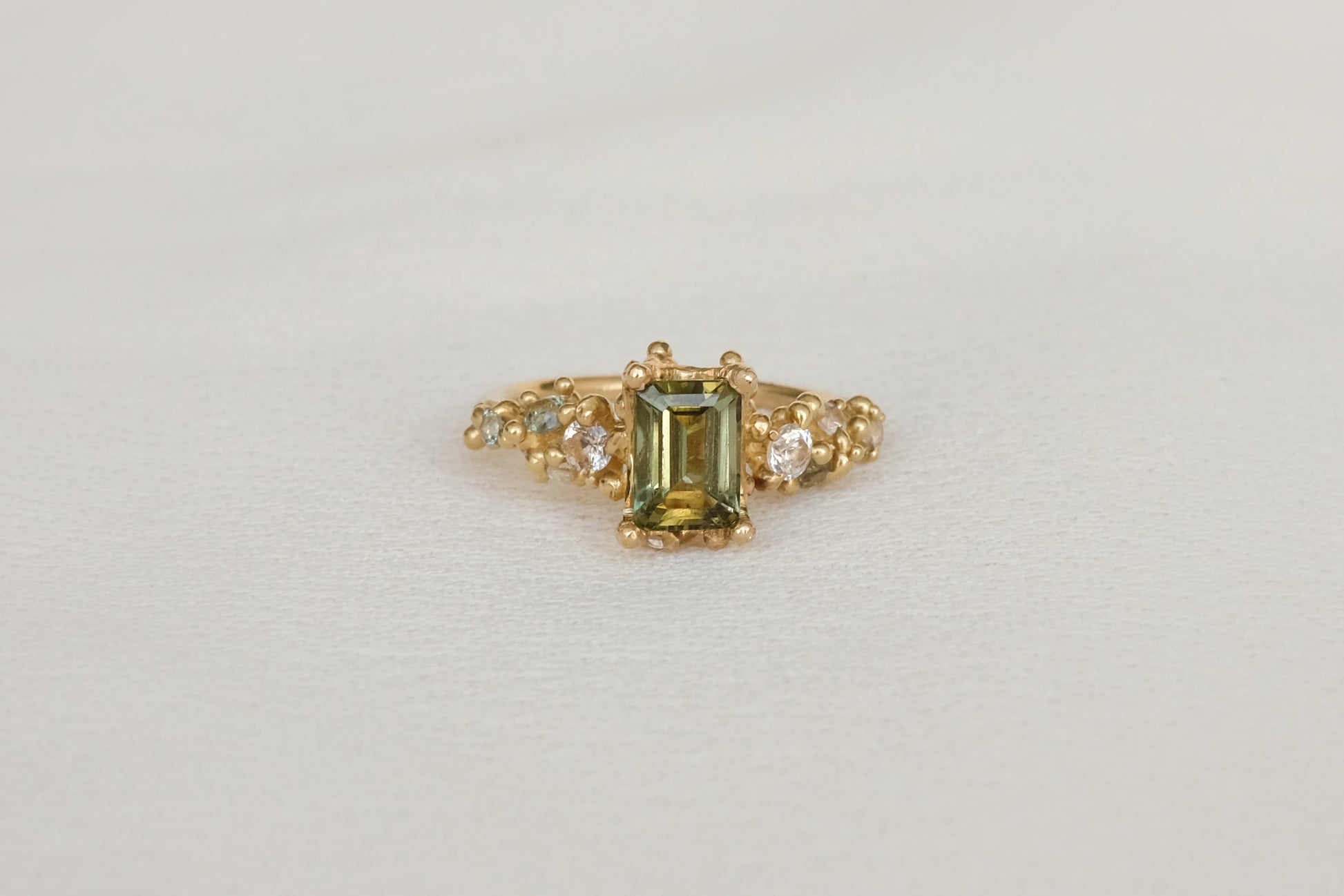 A carefully curated palette gives this ring its fiery undertone. Scattered granules and precious stones in varied cuts are meticulously pieced together to form this chromatic cluster. The sublime lustre of 0.9ct tourmaline takes centre stage and sapphires set around the main stone in the company of an 18K yellow gold band.