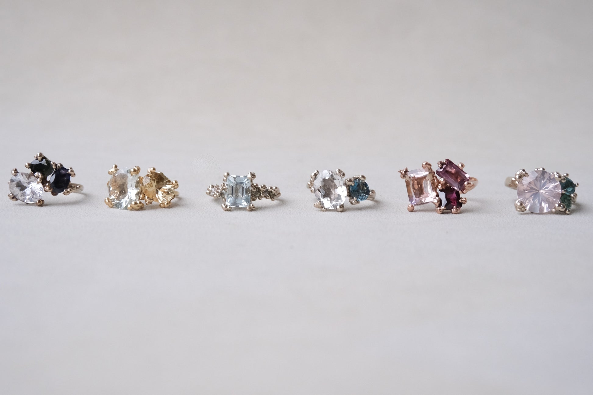 A carefully curated palette gives this ring its fiery undertone. Scattered granules and precious stones in varied cuts are meticulously pieced together to form this chromatic cluster. The sublime lustre of topaz and apatite takes centre stage in the company of an 18K white gold band.