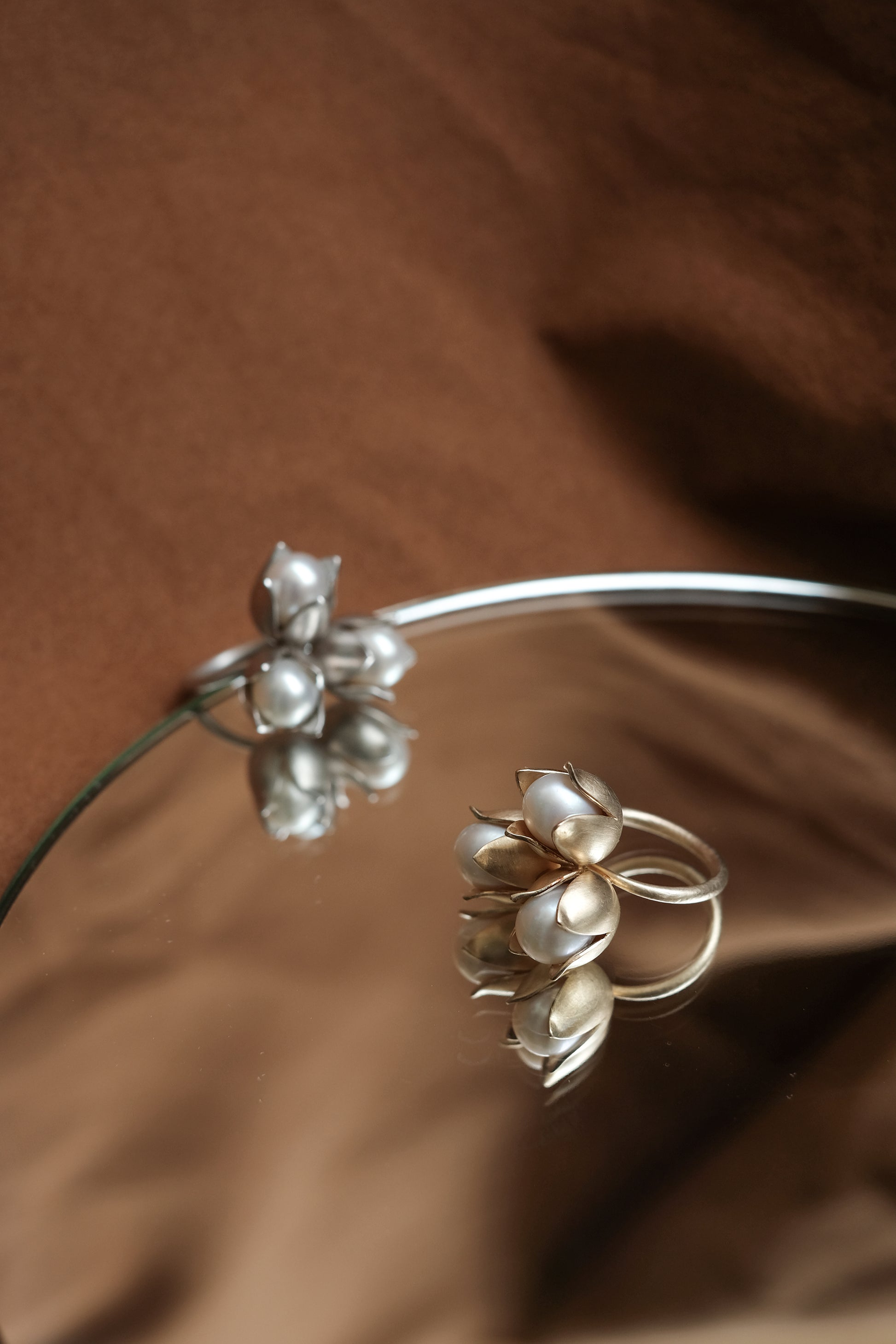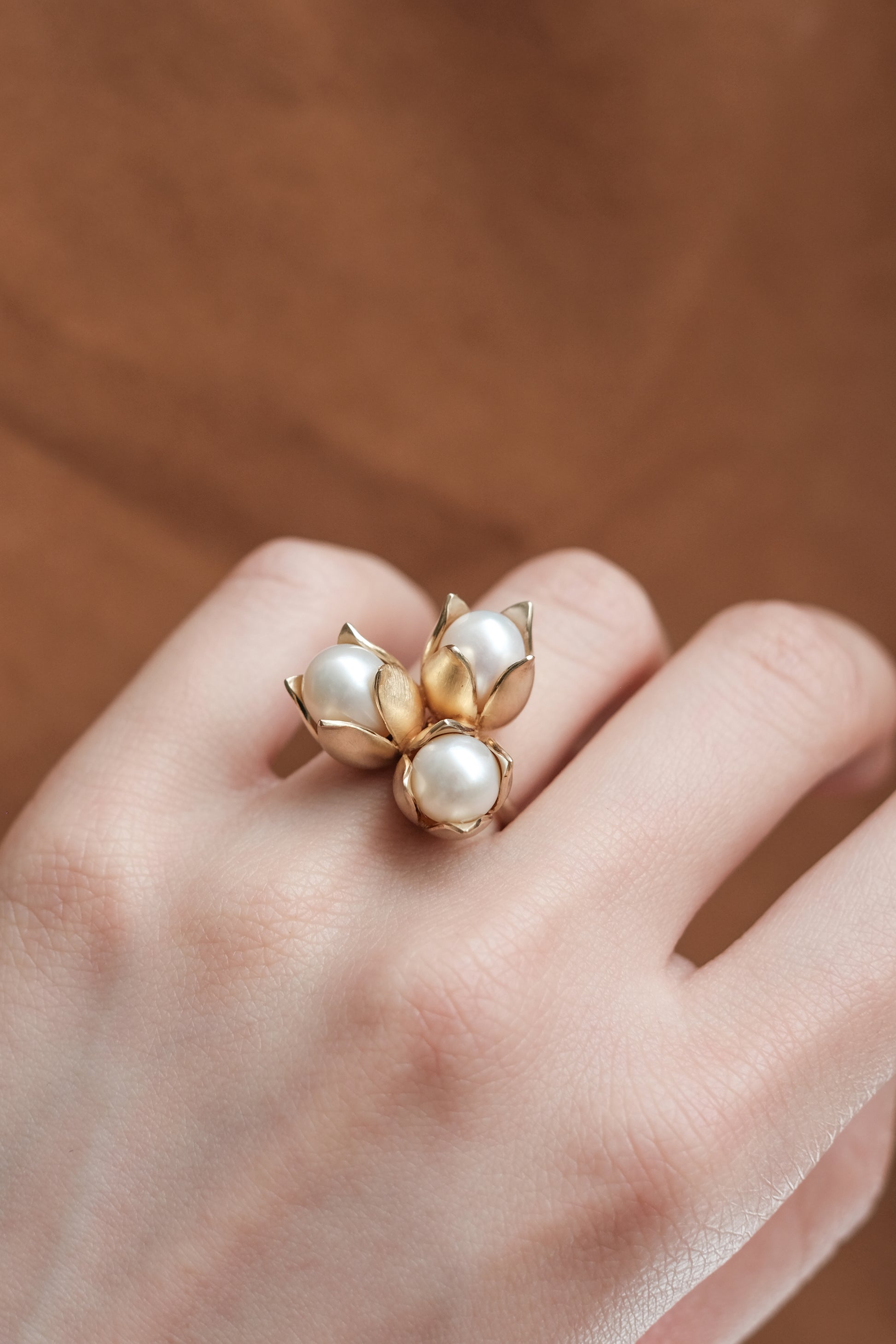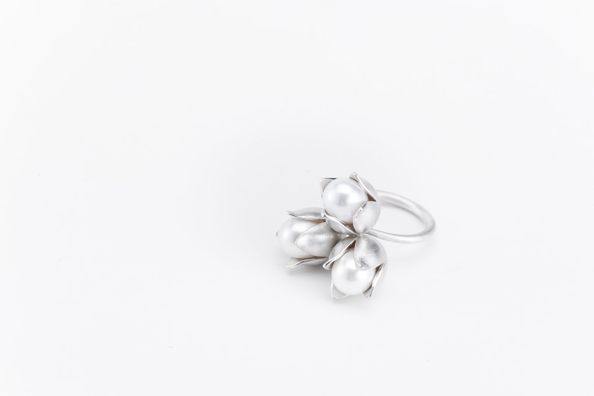 Every girl dreams of holding a bouquet of flowers someday in her life. Belinda translated this fantasy into her designs and manifested as this Triple Flora Pearl Ring. The timeless combination of pearls and precious metal complemented with a contemporary design makes this "the one ring" a girl should always have in her personal collection.
